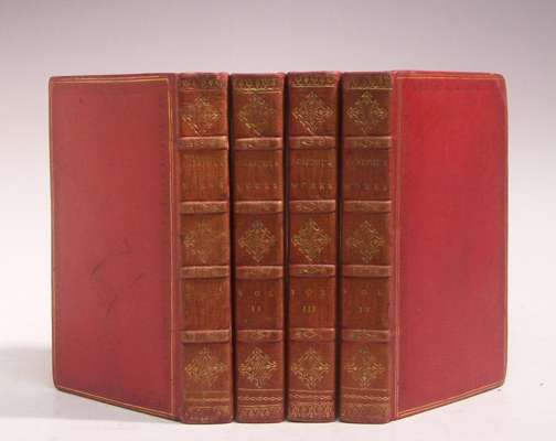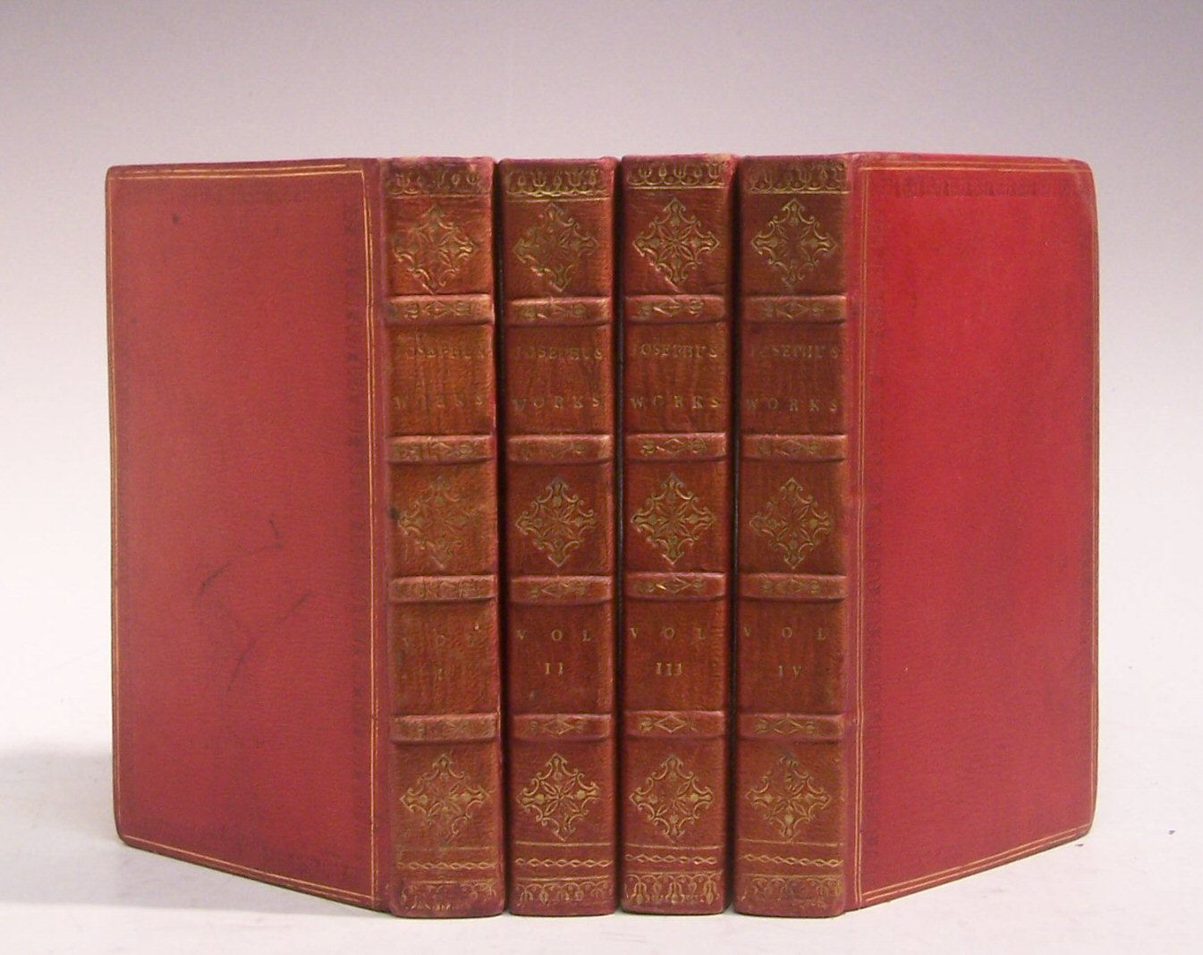The works of ... London, 1811, 8vo, 4 volumes, translated by William Whiston, portrait frontispiece, contemporary red morocco gilt, a.e.g., some fading to backstrip, offsetting to title of volume one, spotting (4)