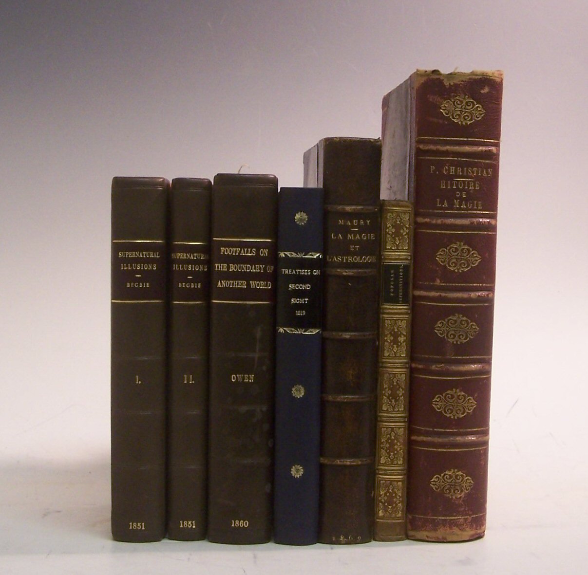 Supernatural illusions. London, 1851, 8vo, 2 volumes, modern half calf gilt; Owen, Robert Dale Footfalls on the boundary of another world. London, 1860, 8vo, modern half calf gilt; Insulanus, T. Treatises on the second sight. Glasgow, 1819, 8vo, modern quarter cloth gilt, last leaf stained; Mayo, Herbert On the truths contained in popular superstitions with an account of mesmerism. Edinburgh, 1851, second edition, 8vo, contemporary half calf gilt, rubbed, some spotting; Lang, A Cock Lane and common-sense, 1894, number 41 of 60 large paper copies, original boards; Lee, F.G. The other world or glimpses of the supernatural, 1875, 2 volumes; Lévy, E. Transcendental magic, 1896, 2 copies, bindings lightly marked; Ibid. The key to the mysteries, 1959; Snow, H. Spirit intercourse, Boston, 1853; Mayo, H. On the truths contained in popular superstitions, 1851; Newnham, W. Essay on superstition, 1830, later cloth; De Morgan, A. A budget of paradoxes, 1872; Theobald, M. Spirit workers in the home circle, 1887, rebacked; King, J.H. The supernatural, 1892, 2 volumes, bindings spotted, one rubbed; Owen, R.A. Footfalls on the boundary of another world, 1860; Knowlson, T.S. The origins of popular superstitions and customs, 1930; Aveling, F. Directing mental energy, 1927, calf; [Thomson, A.D.] On mankind their origin and destiny, 1872; ; Chislett, T.H. Spirits in the house, 1949; Flammarion, C. The unknown, 1900; Budge, E.A.W. The Rosetta stone in the British museum, 1929; Myer, I. Oldest books in the world, New York, 1900; Boismont, A.B. de On hallucinations, 1859, library stamp on title; Brewster, D. Letters on natural magic, 1868; [Davenport, R.A.] Sketches of imposture, deception and credulity, 1837, engraved frontispiece; Phene, J.S. On prehistoric traditions and customs in connection with sun and serpent worship, 1875, bound with others; Carnahan, J.R. Pythian knighthood, Cincinnati, 1888, calf-backed boards; Podmore, F. Studies in psychical research, 1897; Hill, J.A. Spiritualism, 1918; Carrington, H. The physical phenomena of spiritualism, [n.d.]; Street, J.C. The hidden way across the threshold, 1887; Cooper, W.E. Spiritual science, 1911; all original cloth except where noted, a few slightly rubbed or marked; and others on magic, psychic phenomena, ghosts, &c. (quantity)