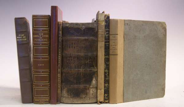An essay on the nature, design and origin of sacrifices, 1748, 8vo, calf-backed boards, 8vo, advertisement leaf, number in ink at head of title; Davison, J. An inquiry into the origin and intent of primitive sacrifice, 1825, 8vo, original boards, head of spine chipped; [Anon.] Two discourses of purgatory, for R. Chiswell, 1687; Amos. A. The great oyer of poisoning, 1846, extra-illustrated with numerous plates, brown morocco gilt by Bayntun, g.e.; [Fassman, D.] Gesprache in dem Reicher derer Todten. Leipzig, 1722, 4to, first frontispiece defective, 1 plate torn, some browning and worming of lower margin, old calf, very worn; La danse des morts... de l'eglise St. Jean à Bâle. Basle: Birmann, [c.1836], 4to, plates, upper wrapper bound in, modern calf, ?lacking German title, slight soiling; Holbein, H. The dance of death. London, 1803, 8vo, frontispiece, 47 plates, contemporary boards, some foxing; Holbein, H. The dance of death. London, 1804, 8vo, frontispiece, 33 plates [one folding], contemporary half calf gilt, upper board loose, ink notes on endpaper and another 1804 copy in boards, disbound; Holbein, H. The dance of death, 1816, 8vo, engraved plates, half roan, some spotting, rubbed (10)