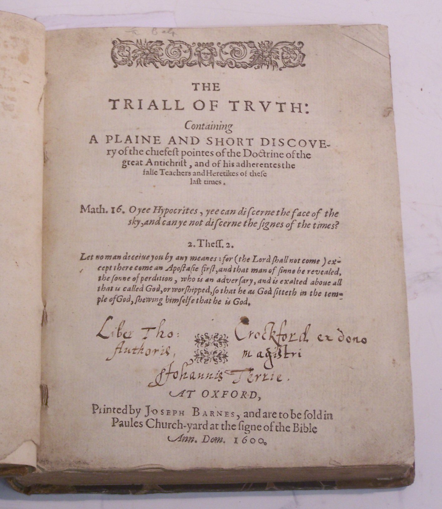 The triall of truth. Oxford: Joseph Barnes, 1600-02, 2 parts in one volume, 4to, first edition, inscription on title "Liber Tho: Crockford ex dono Authoris, magistri Johannis Terrie", another contemporary inscription on front free endpaper, burn-hole with slight loss to a couple of letters, later half calf, extremities worn