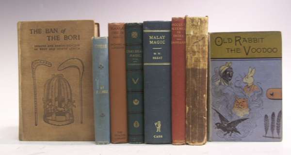 The ban of the Bori, demons and demon-dancing in west and north Africa. London, [1914], 8vo, illustated, original decorative cloth, some fading, lacking front endpaper; Owen, Mary Old rabbit the voodoo and other sorcerers. London, 1893, 8vo, illustrated, original decorative cloth , some rubbing; Deane, Rev. John The worship of the serpent traced throughout the world. London, 1833, second edition, 8vo, presented by the author to P.D. Foulkner, 4 leaves of publishers adverts at front, original boards, worn, lacking top of backstrip, uncut; Bell, H.J. Obeah witchcraft in the West Indies. London, 1893, second edition, 8vo, original cloth, rubbed; Loederer, Richard Voodoo fire in Haiti. London, 1937, second edition, 8vo, original cloth; Lenormant, Francois Chaldean magic. London, [no date], original decorative cloth; Skeat, Walter W. Malay magic. London, 1965, 8vo, original cloth; Jacolliot, Louis Occult science in India and among the ancients. London, 1919, 8vo, original cloth; and 19 others (27)