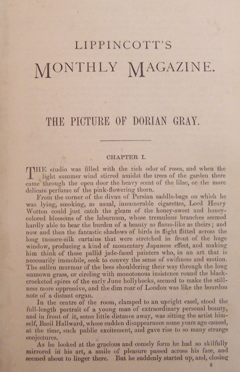 The picture of Dorian Gray. [Philadelphia]: Lippincott's Monthly Magazine, 1890, 8vo, later half morocco gilt, rubbed at edges, lacks the wrappers, occasional soiling or spotting, small ink stain to page edges, contemporary ink inscription on front endpaper
