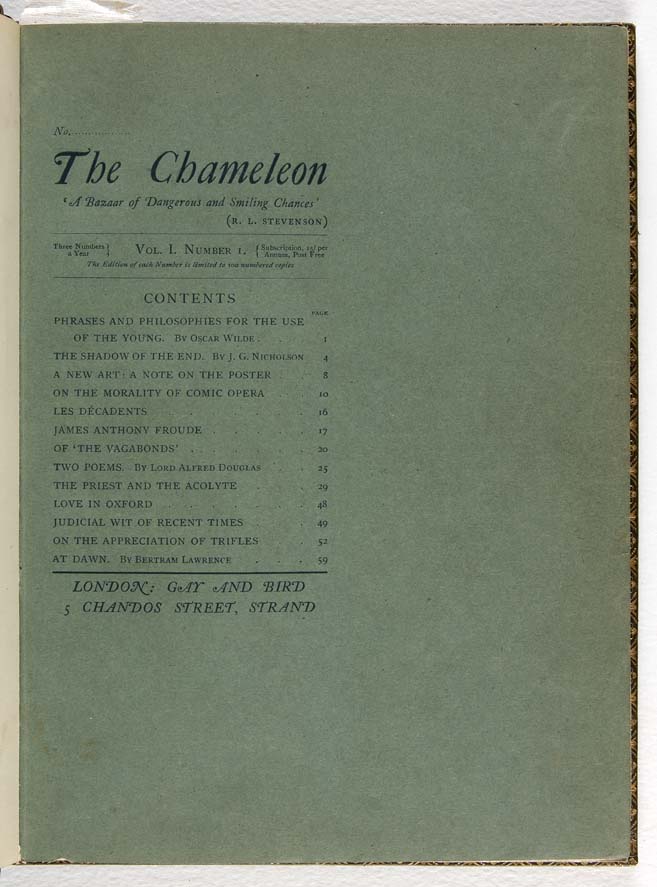 Note: Very scarce. Wilde had been invited to contribute a handful of witticisms to The Chameleon, the Oxford University journal, which also included a poem written by Wilde's lover, Lord Douglas. Wilde's obvious link to the journal was later used as evidence in his trial for acts of indecency in which the prosecutor interrogated Wilde about the last line of Douglas' poem Two Loves, "the love that dares not speak its name." As a result, Wilde was arrested and convicted of gross indecency and sentenced to two years hard labour.