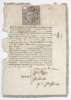 Licence granted by two deputies of King Philip IV on 16th May 1636 at Ypres to Andrea de Buckere, merchant, permitting him to transport three bales each containing fifty pieces of black cloth (?) made in that town to Dunkirk, with instructions for Nicholas and Robert van Muelebeque (?) etc. to convey them to Joan Jacomo Swaen (?) at Malaga. Pro-forma document, 11" x 71/2", Roman letter, approx. 14 lines of print plus Ms. additions, the latter stating the parties and commodities involved and the date and showing 4 autographs, including those of Andrea de Buckere and Pedro van der Beke: the second was one of the two Spanish deputies, engraved arms, probably of Philip IV, floral border round 3 sides, though largely worn away along top, left-hand edge also frayed, hole through engraved surface (not touching coat-of-arms), tear through one corner, paper fragile and lightly foxed, contemporary Ms. writing in parts of the document left blank for the purpose, giving names and other details