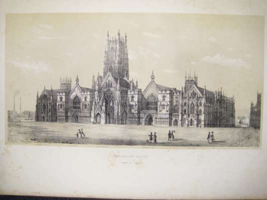 Designs for the Houses of Parliament. London: for the Author, [1842]. First edition, oblong elephant folio, 4 plans on india paper, and 28 plates by H. Jones and others after Hopper (27 lithographed, 1 engraved), one plate on india paper, list of subscribers with one name neatly added in pen facsimile, contemporary maroon half morocco, gilt lettering piece on upper cover, preserved in new folding cloth and buckram case, with morocco lettering piece, somewhat spotted, some marginal repairs, one repair just extending into image