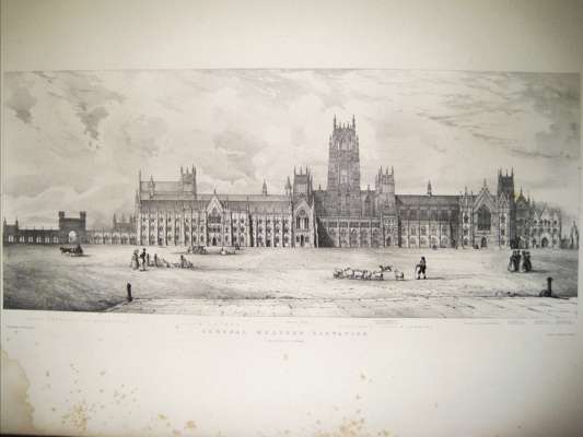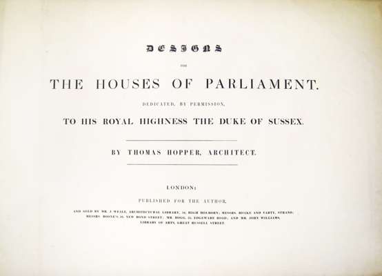 Note: Despite a lucrative private practice, in the competitions for public buildings that formed such a significant feature of late Georgian architectural activity, Hopper was almost uniformly unsuccessful. Defeated by Barry in the Houses of Parliament competition, 1835–6, Hopper was one of the most persistent and percipient critics of the competition judges, setting out detailed grounds for objection in his Letter to the … First Commissioner of his Majesty's Works (1837); pursued the controversy in Hopper versus Cust, on the … Rebuilding of the Houses of Parliament (1837); and eventually went to the considerable expense of publishing his own designs in this large sumptuous elephant folio.