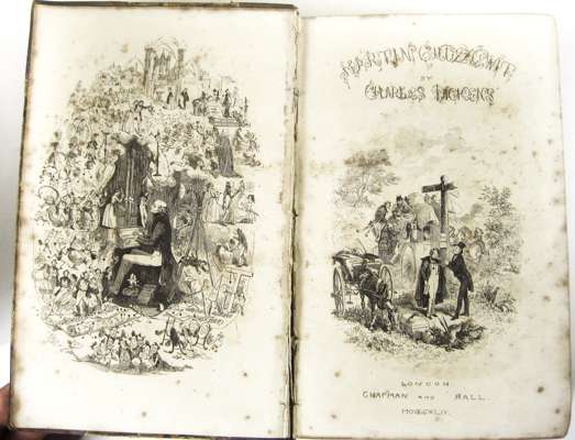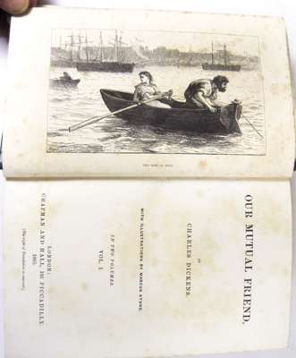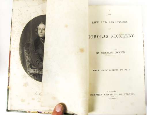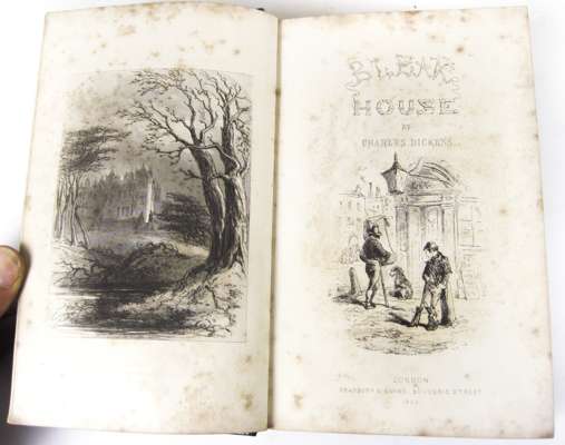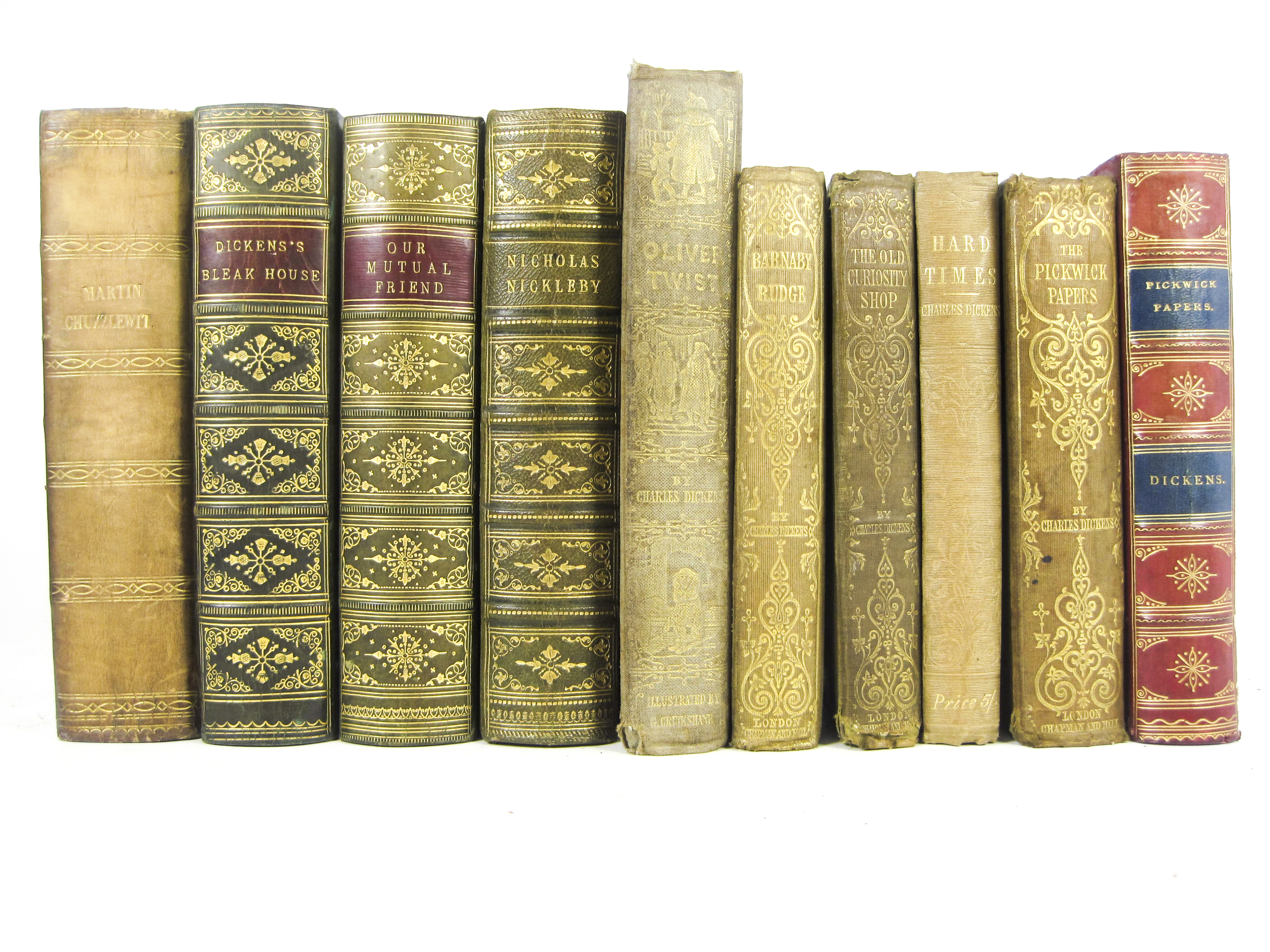 The life and adventures of Nicholas Nickleby. London, 1839. First edition in book form, 8vo, frontispiece and 39 plates, green half morocco, some spotting; [Idem] The life and adventures of Martin Chuzzlewit. London, 1844. First edition in book form, additional engraved title and 39 plates, contemporary half calf, spotting, one plate loose; [Idem] Bleak House. 1853. First edition in book form, additional engraved title and 39 plates by H.K. Browne, contemporary half calf, spotting, upper hinge weak; [Idem] Our mutual friend. 1865. First edition in book form, 2 volumes in one, 40 plates, contemporary half calf gilt; [Idem] The adventures of Oliver Twist. 1846. 8vo, plates by Cruikshank, original cloth, rubbed; [Idem] The old curiosity shop. 1848. 8vo, frontispiece, original cloth, some dampstaining, rubbed; [Idem] Hard Times. 1854. 8vo, original cloth, spine faded; [Idem] Barnaby Rudge. 1857. 8vo, frontispiece, original cloth, spine faded, upper hinge weak; and 2 others by Dickens (11)