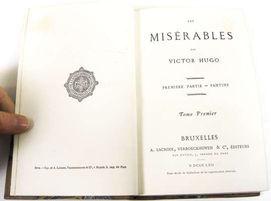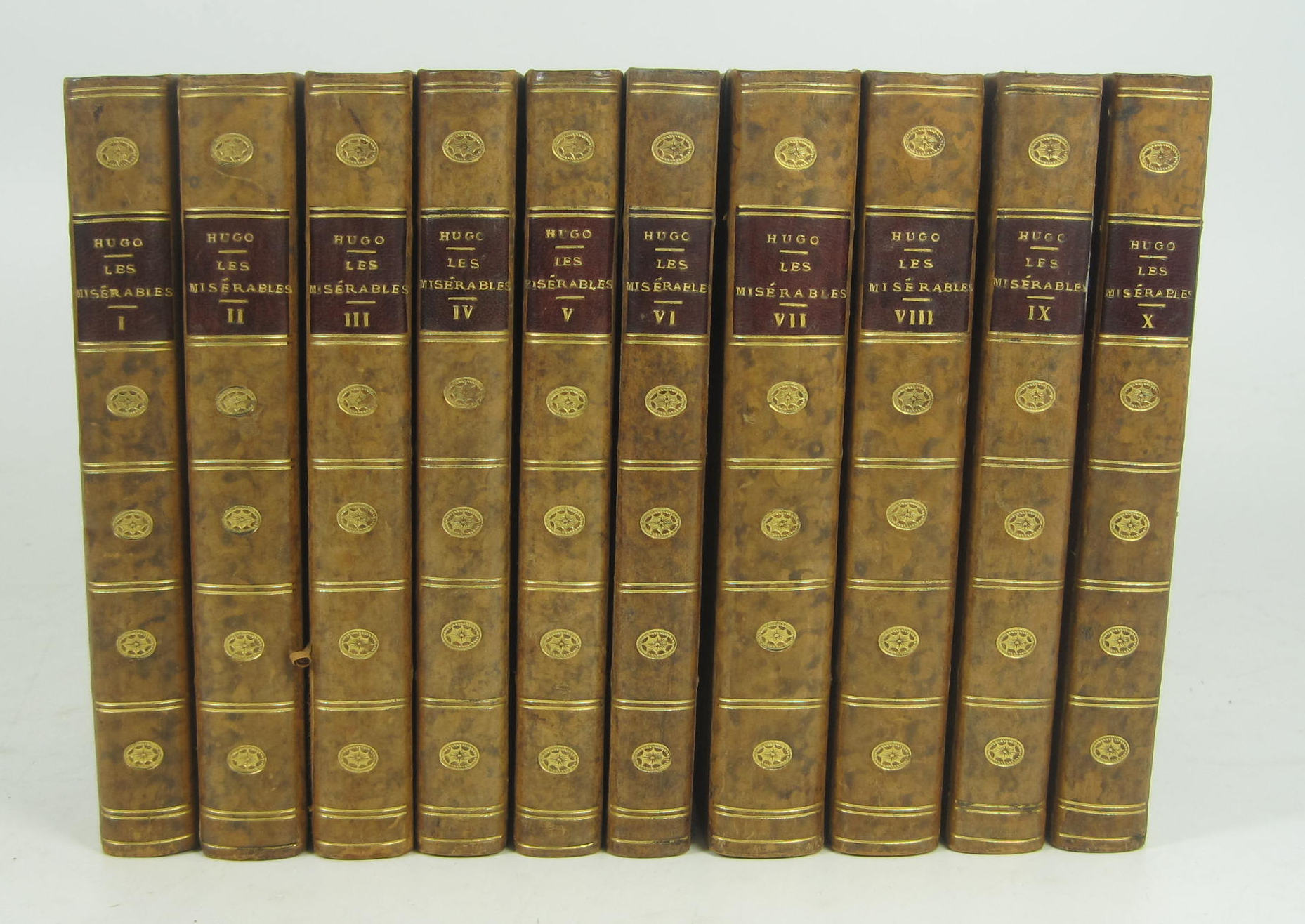 Les misérables. Brussels: A. Lacroix, Verboeckhoven & Co., 1862. 10 volumes, 8vo, in contemporary, or slightly later, half calf with red morocco labels and gilt tooling to spines, marbled edges, bookplates (10)
