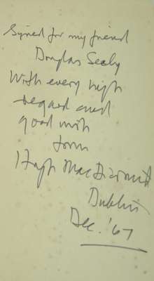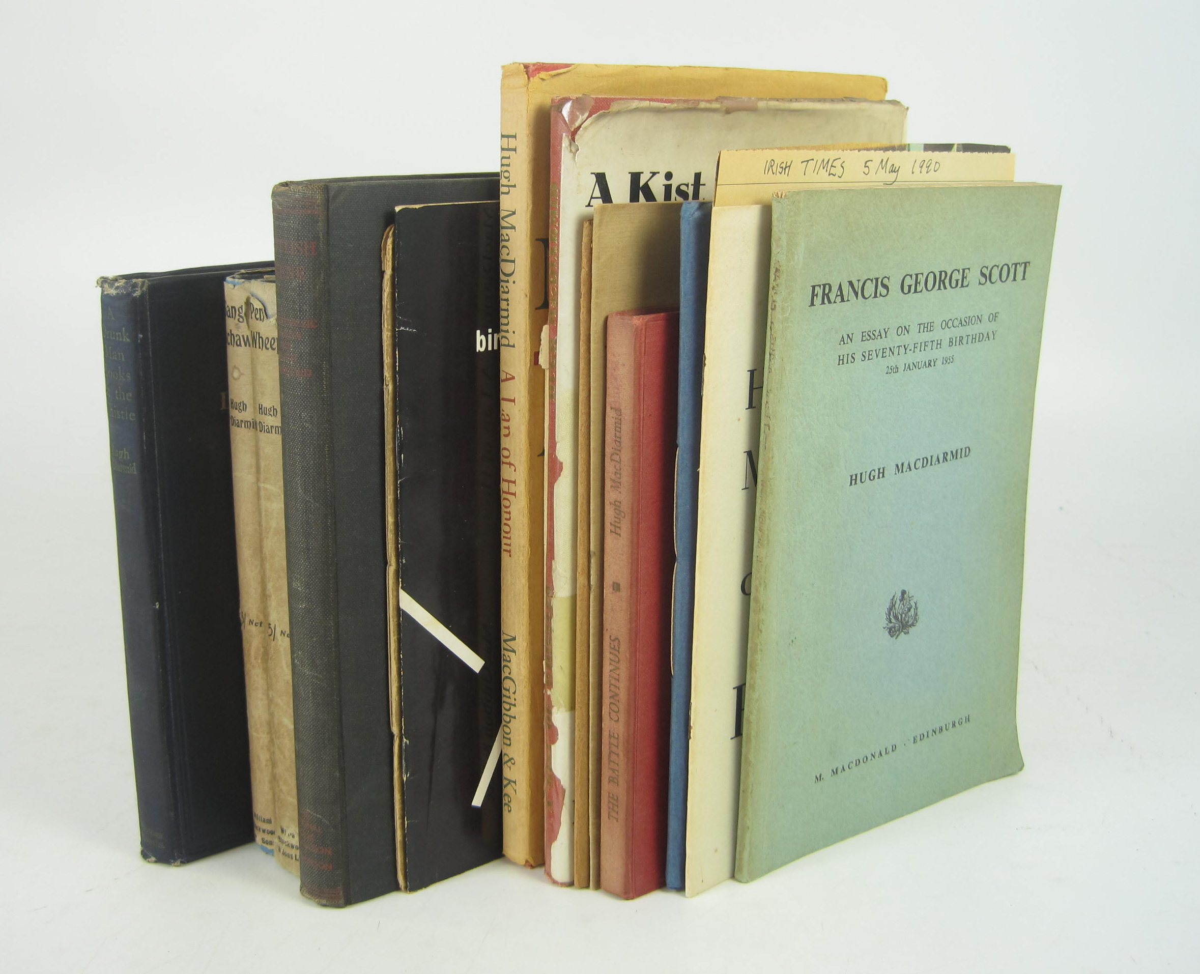 [Idem] Another copy, signed; [Idem] A drunk man looks at the thistle. Edinburgh & London: William Blackwood, 1926. 8vo, inscribed by MacDiarmid to Douglas Sealy, blue cloth gilt; [Idem] The lucky bag. Edinburgh: The Porpoise Press, 1927. 8vo, brown wrappers, signed by MacDiarmid to first page; [Idem] Scottish scene, or the intelligent man's guide to Albyn, [n.d. 1940?]. 8vo, signed by MacDiarmid to Sealy, black cloth, National Book Association bookplate (no.32); [Idem] The ugly birds without wings. Edinburgh: Allan Donaldson, 1962. 8vo, signed and inscribed by MacDiarmid; [Idem] A lap of honour, 1967. 8vo; [Idem] Three hymns to Lenin, [n.d.] 12mo; [Idem] A kist of whistles, [n.d.] 8vo; [Idem] Sydney Goodsir Smith, 1963. 8vo, out-of-series copy of 135; [Idem] Poems of the east-west synthesis, [n.d.]; and 4 others, sold not subject to return (14)