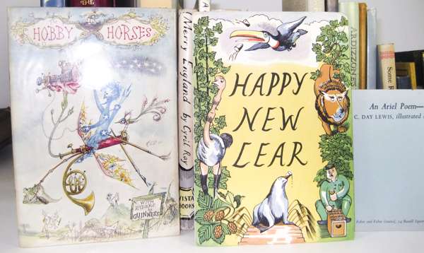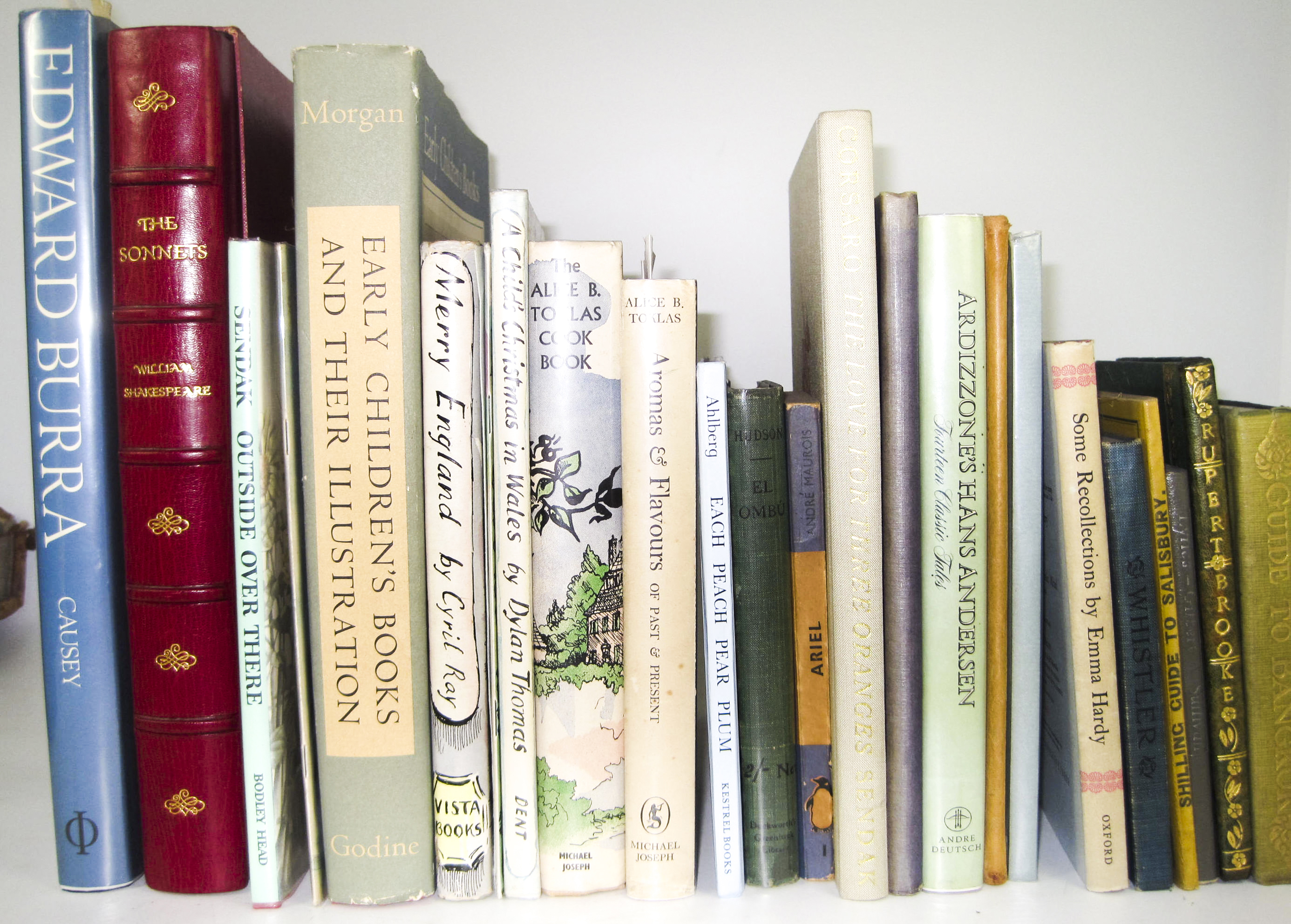 The Royal Shakespeare Theatre edition of the sonnets. London: Shepheard-Walwyn, 1974. 4to, number 46 of 260 copies, red morocco gilt, g.e., slipcase; Guinness Hobby Horses. [N.d.], 8vo, illustrations by Rowland Emmett, wrappers; Guinness Happy New Year. [N.d.], 8vo, illustrations and wrappers by Paul Nash; Brooke, Rupert "1914" Five Sonnets. London: Sidgwick & Jackson, 1915. First edition, 8vo, original wrappers, preserved in flap-case; Sendak, Maurice Outside over there. Bodley Head, 1981. Oblong folio, dustwrapper; Pierpont Morgan Library Early Children's Books and their illustration. New York, 1975. 4to, dustwrapper; Ray, C. Merry England. 1960. 8vo, illustrations & dustwrapper by Ardizzone, price clipped; Lewis, C.Day Ariel Poem. Christmas Eve. 1954, 8vo, illustrated by Ardizzone, in original envelope; Thomas, Dylan A child's Christmas in Wales. 1978. 4to, illustrations and dustwrapper by Ardizzone; Toklas, Alice B. The Alice B. Toklas Cook Book. 1954. First edition, dustwrapper, price clipped; Toklas, Alice B. Aromas & Flavours of past and present. 1959. First edition, dustwrapper; Hudson, W.H. El Ombu. 1902. First edition, 8vo, original cloth; Ahlberg, J. & A. Each peach pear plum. 1978. Oblong 4to, original boards; Maurois, André Ariel. 1935. Penguin Book No. 1, original wrappers, spine discoloured; Causey, Andrew Edward Burra, complete catalogue. 1985. 4to, cloth, dustwrapper; and 11 others, miscellaneous (26)
