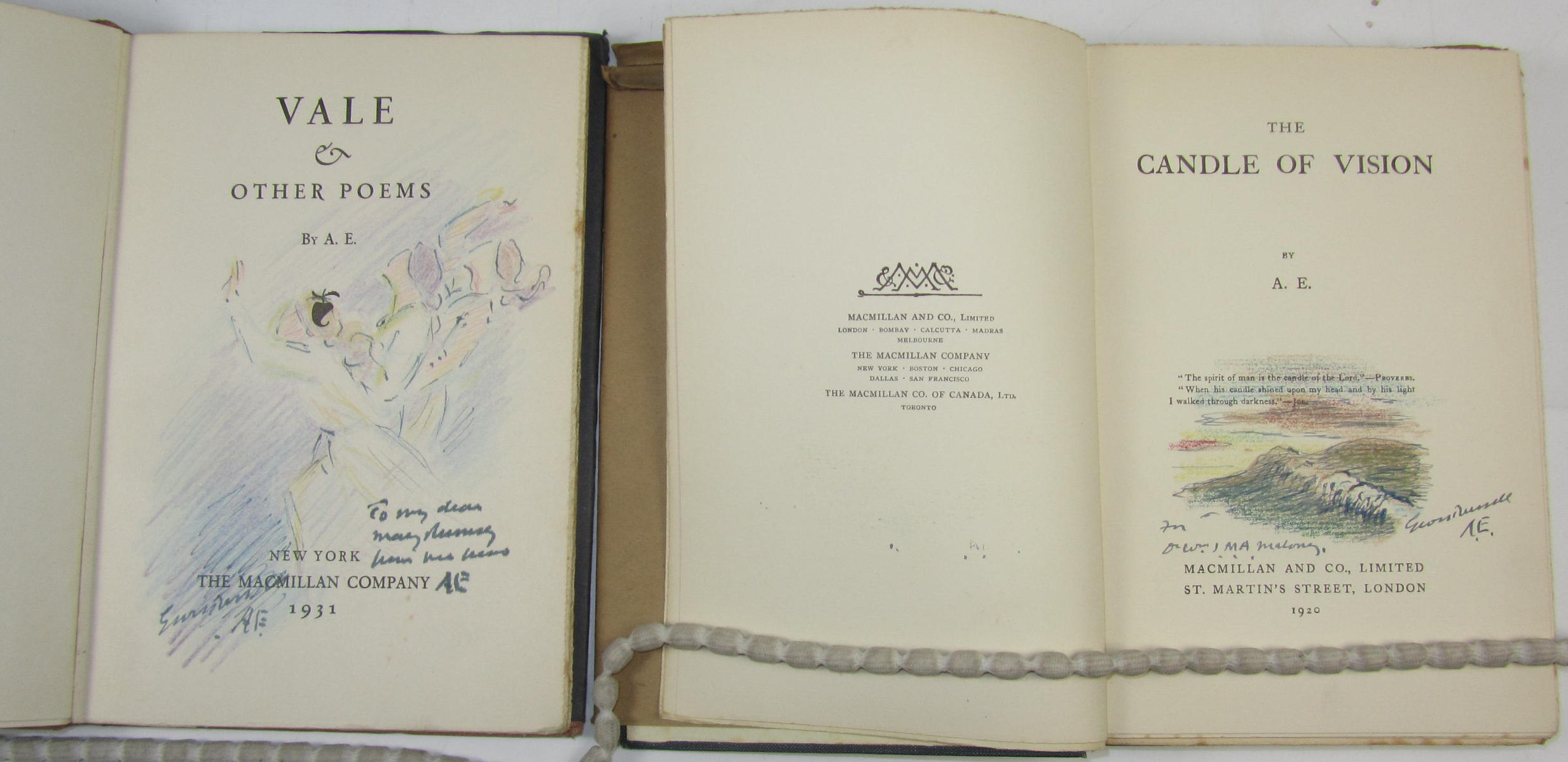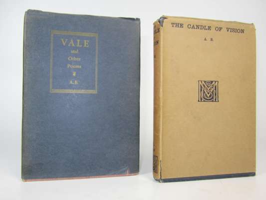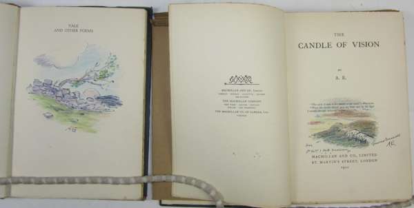 Vale & other poems. New York, 1931. Presentation copy with original coloured pencil drawing on title page, signed A.E., with a second drawing on the sectional title, original cloth, dust-jacket slightly frayed; Russell, G.W. The Candle of vision. London, 1920. Presentation copy to Dr W. J. M.A.M. Malony with original coloured pencil drawing on title, signed George Russell AE, dust-jacket slightly frayed (2)