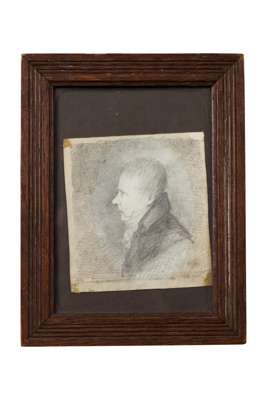 Pencil portrait of Walter Scott, from life, unsigned, by Robert Scott-Moncrieff, [c.1816-20], 9 x 8.1cm., with worn inscription on reverse of frame: "Robert Scott-Moncrieff, born 1793, decd. 18[69], father of Canon William Scott-Moncrieff, also of Fossaway, died in 1901; father of Susan Mary, afterwards, Mrs Herbert L[unn]; her daughter, Constance Lunn, afterwards Mrs Colin Scott-Moncrieff. Pencil portrait of Sir Walter Scott from life, by Robert Scott-Moncrieff of Fossaway. Given by Robert Scott-Moncrieff's daughter... to George Scott-Moncrieff"; together with 4pp. typed script "An unknown portrait of Scott" by George Scott-Moncrieff