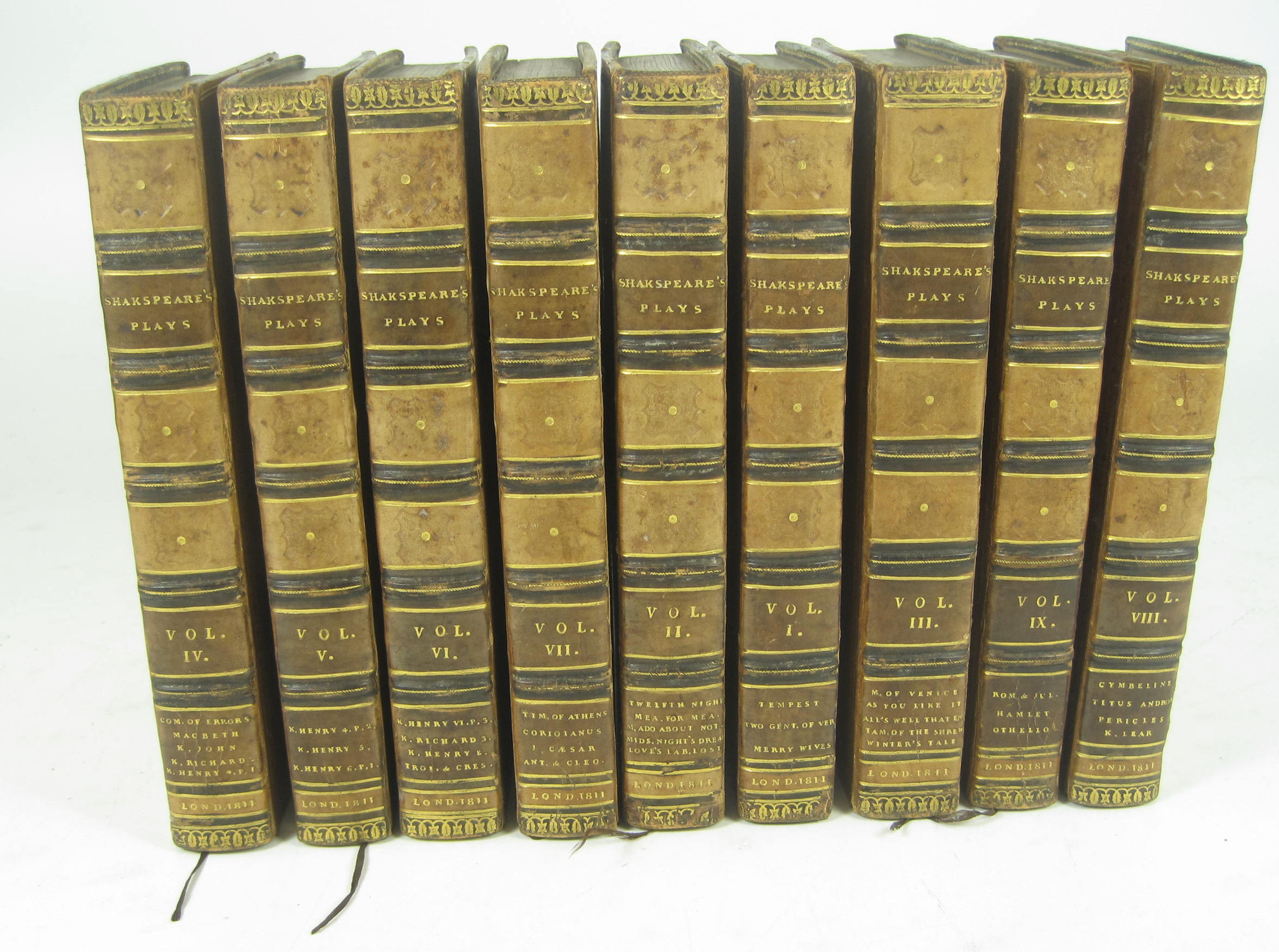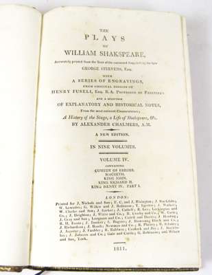 The plays., edited by Alexander Chalmers. London: J. Nichols [&c.], 1811. 9 volumes, 8vo, engraved frontispiece portrait, contemporary diced calf gilt, armorial bookplates