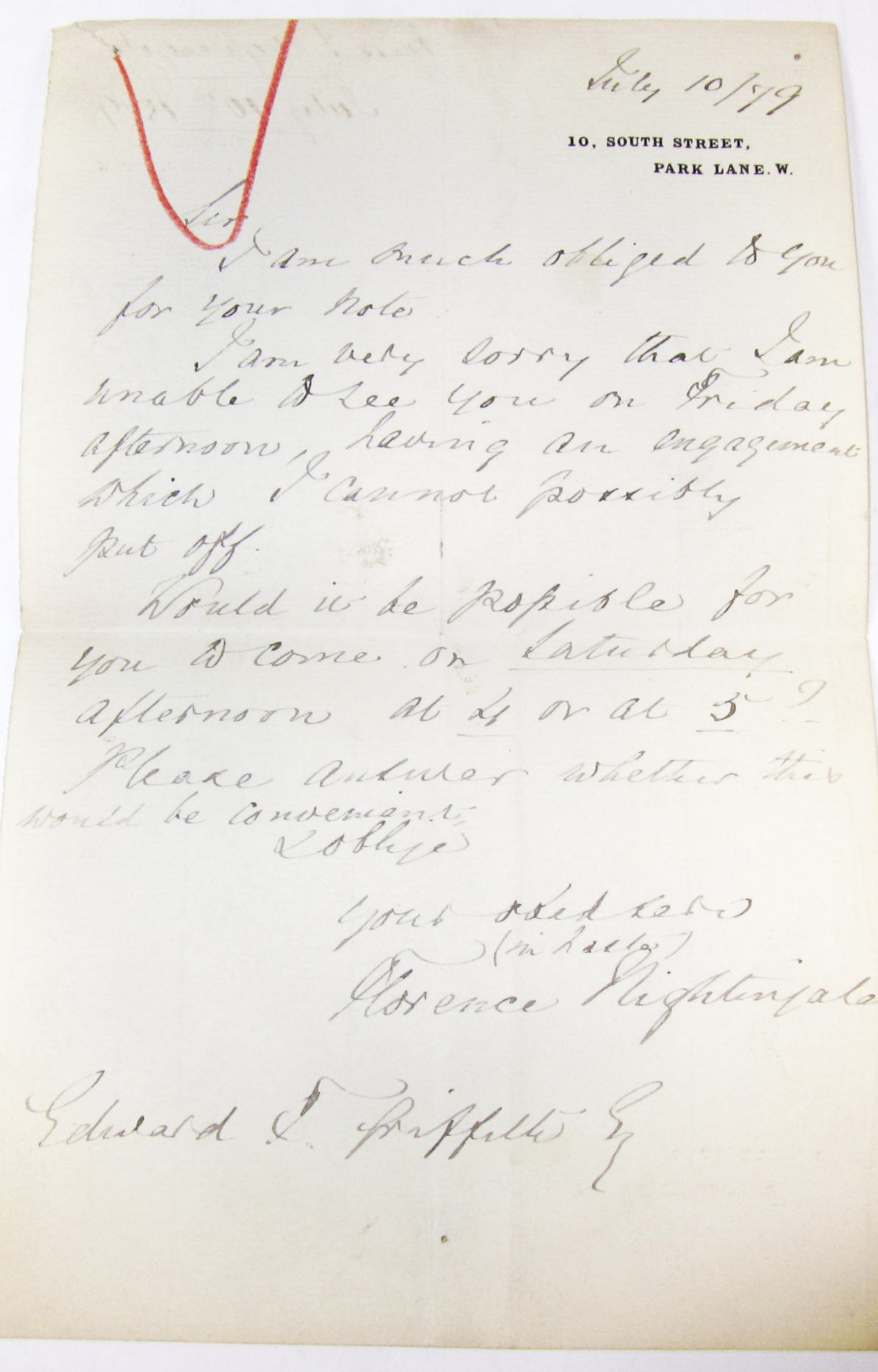 A.L.S. to Edward F Griffiths, asking him to visit her on a different date, and signing herself "your ... hero", one page, 10 July 1879, 10 South Street, Park Lane W.
