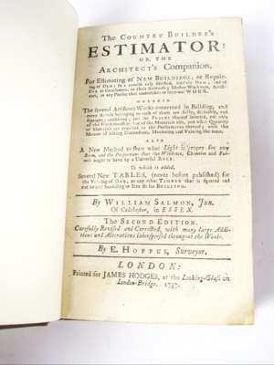 The country builder's estimator: or the architect's companion. London: James Hodges, 1737. Second edition, 8vo, rebound in brown morocco gilt in 1954 by Anthony Gardner OBE, calligraphic note from the binder to paste-down endpaper and invoice with note for the binding loosely inserted, the ESTC suggests the presence of unpaginated tables, which this volume does not have [ESTC T201599]