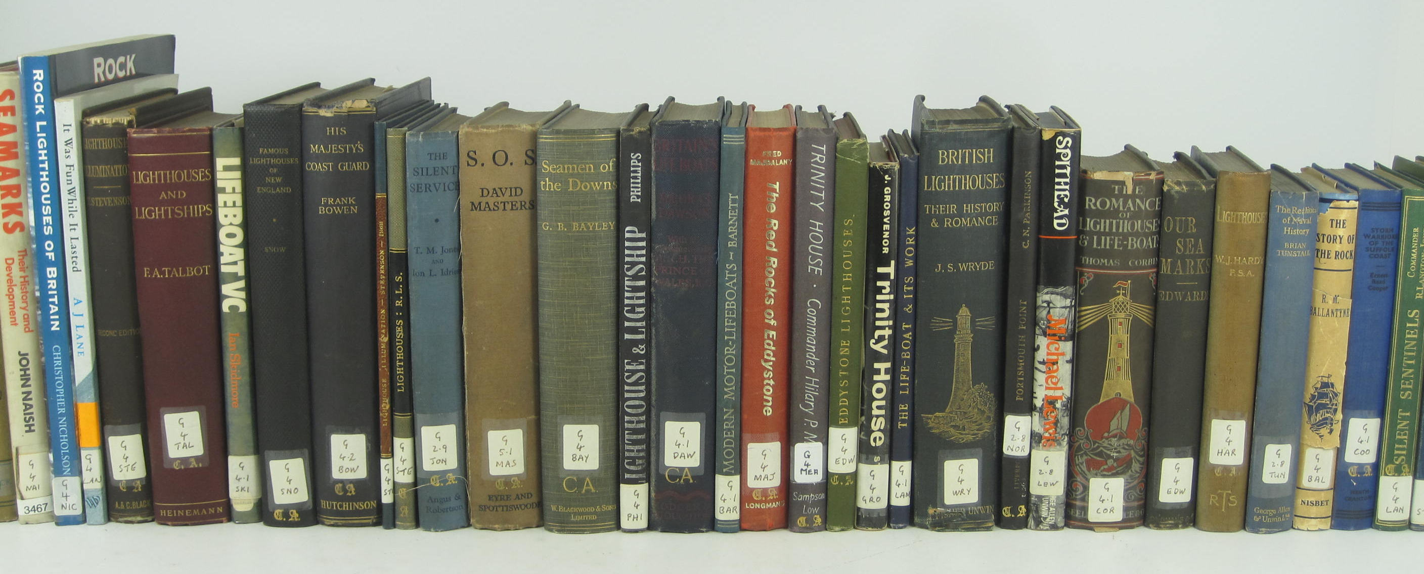 Some new arrangements for lighthouse illumination… Edinburgh, 1868; Stevenson, Robert Louis Notice of a new form of intermittent light for lighthouses. Edinburgh 1871; Edwards, E. Price Our seamarks, 1884; Hardy, W.J. Lighthouses, 1895; Wryde, J. Saxby British lighthouses..., [1913]; Edwards, E. Price The Eddystone lighthouses (new and old), 1882; Corbin, T.W. The romance of lighthouses & lifeboats, 1926; Stevenson, Thomas Lighthouse illumination... Edinburgh: Adam and Charles Black, 1871; Talbot, Frederick A. Lightships and lighthouses, 1913; and 23 others, Cruising Association gilt stamps and bookplates; sold not subject to return (32)