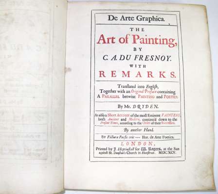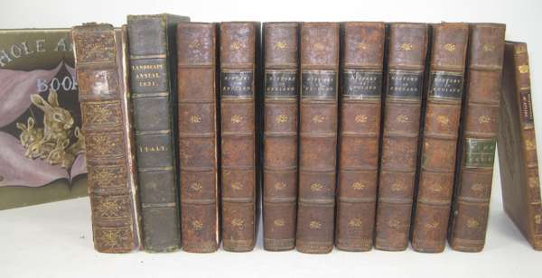 The art of painting. London: J. Heptinstall, 1695. 4to, translated by Mr Dryden, additional engraved title, printed title in red and black, contemporary calf, worn, revealing another calf gilt binding beneath, worn, one cover detached; Roscoe, Thomas The tourist in Italy. London, 1831. 8vo, additional title and 25 (of 26) plates on india paper, contemporary green morocco, g.e., upper hinge broken; Hume, David The history of England. 1813. 8 volumes, 8vo, plates, contemporary calf; Philip, A.P.W. On the treatment of the more protracted cases of indigestion. London, 1827. 8vo, contemporary calf, armorial bookplate of Lord Gray, slightly rubbed; Barker, B. and N. The hole and corner book. Edinburgh: W. & R. Chambers, [c.1919]. Oblong 4to, plates, original pictorial boards (12)