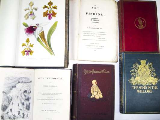 Sport in Norway. 1864. First edition, 8vo, 2 plates, illustrations, original cloth, slightly spotted, binding somewhat soiled; Charleton, T.W. The art of fishing. North Shields: Printed for the Author, 1819. First edition, 8vo, errata slip, original wrappers, uncut, spine worn; Thompson, Robert The gardener's assistant. London: Blackie, [1859]. 4to, 12 hand-coloured engraved plates, contemporary half calf, rubbed, short split at head of joints; Grahame, Kenneth The wind in the willows. 1909. Fourth edition, 8vo, original pictorial cloth gilt; Dodgson, C.L. "Lewis Carroll" Through the Looking-Glass. 1885. 8vo, illustrations, original pictorial cloth, spine faded; Andersen, Hans Fairy tales. Raphael Tuck, [c.1880]. 4to, 8 chromolithographed plates, original pictorial cloth gilt; and 3 others (9)