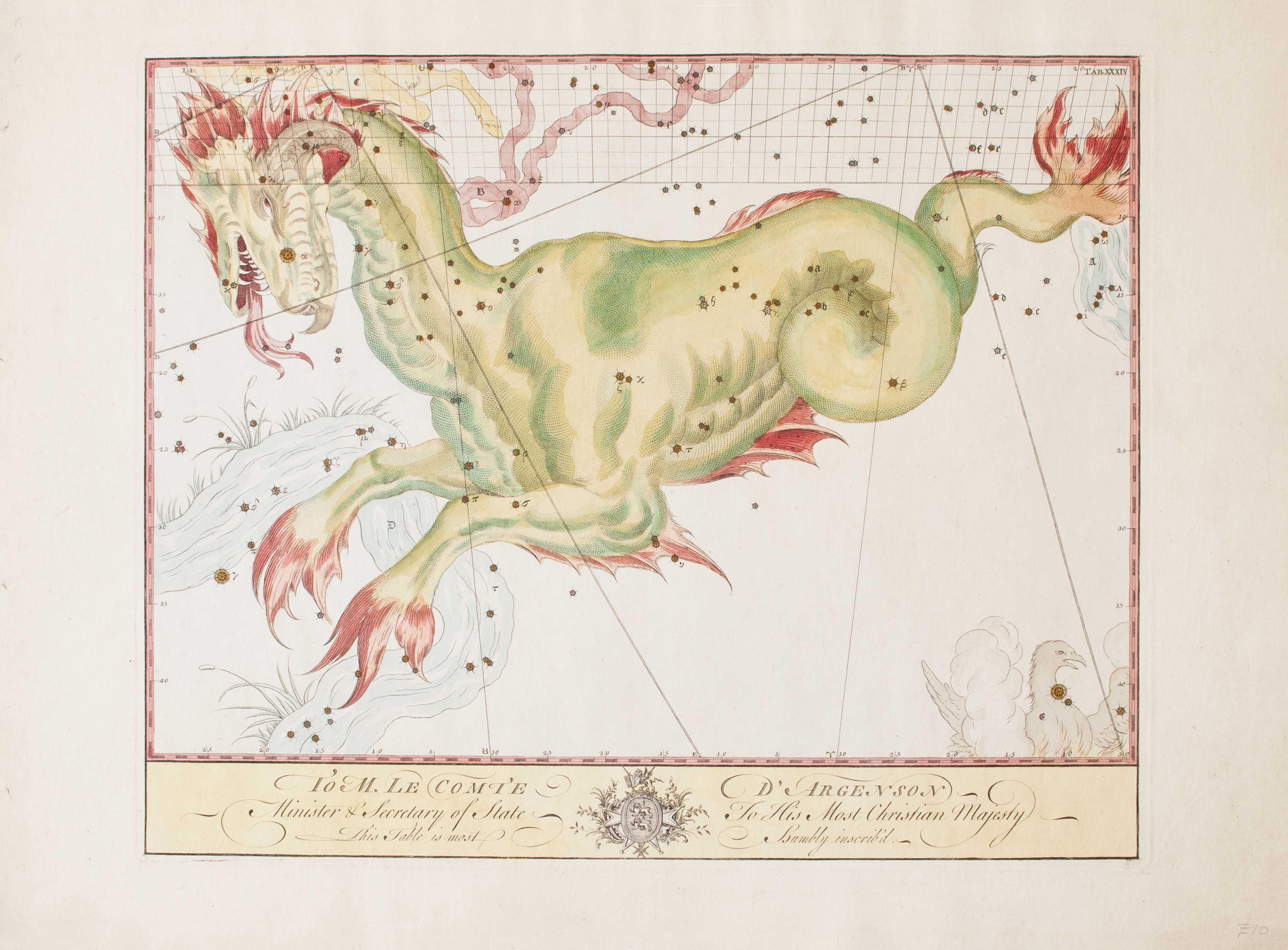 Note: Dr John Bevis, 1695-1771, was a physician and astronomer, probably best known as the discoverer of the Crab Nebula. In 1738, Bevis commenced work on his impressive star atlas, the Uranographia Britannica, which was intended for publication in 1750. Unfortunately, before the project could be completed, the publisher John Neale was faced with bankruptcy. Instead, impressions were taken from the printing plates which had already been created and compiled into composite volumes, often known as the Atlas Celeste. Around 17 of these atlases, with 51 plates each, are known to exist.