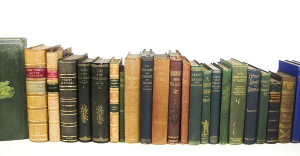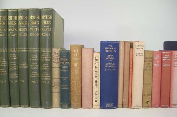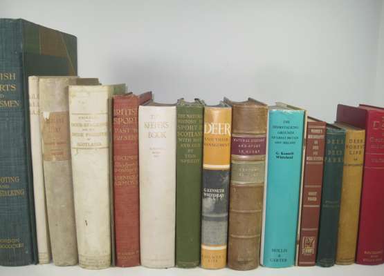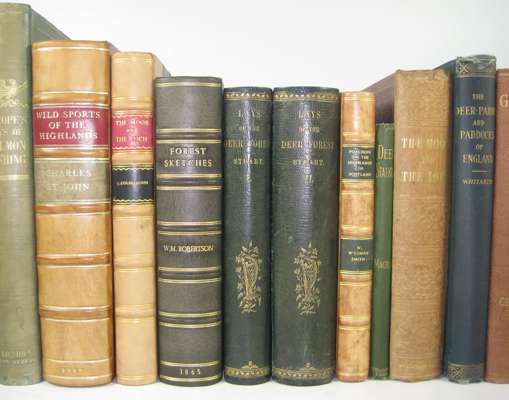 Wild sports and Natural History of the Highlands. 1927. 8vo, half calf gilt; [Robertson, W.] Forest sketches. 1865. 8vo, plates on india paper, black half morocco; Sobieski, John Lays of the Deer Forest. 1848. 2 volumes, 8vo, plates, green quarter morocco gilt; Colquhoun, John The Moor and the Loch. 1841. Second edition, 8vo, plates, half calf gilt; Smith, W.M. The Romance of Poaching in the Highlands of Scotland. 1904. 8vo, half calf gilt; Jeans, T. The Tommiebeg shootings. 1864. 12mo, half calf; Scrope, W. Days and Nights of Salmon Fishing in the Tweed. 1843. 8vo, lithographed title and 12 hand-coloured plates, original cloth gilt; Grimble, Augustus Deer-stalking. 1886. First edition, 8vo, original cloth; Boner, Charles Forest creatures. 1861. 8vo, original cloth; Money, A.W. Guns, ammunition and tackle. 1904. 8vo, original cloth; Colquhoun, J. The Moor and the Loch. 1851. 8vo, plates, original cloth; Chapman, F. Gun, rod & rifle. 1908. 8vo, presentation copy from author, original cloth, spine faded; Whitaker, J. A descriptive list of the deer-parks and paddocks of England. 1892. 8vo, original cloth; Abbott, S. Ardenmohr among the hills. 1876. 8vo, original cloth; Conway, J. Forays among Salmon and Deer. 1861. 8vo, original cloth; Roberts, Sir R. Glenmahra, or the Western Highlands. 1870. 8vo, original cloth; Hall, R. The Highland Sportsman and Tourist. 1885. 8vo, plates, original cloth; Hall, H.B. Highland sports. [c. 1860]. 2 volumes, 12mo, cloth; Butler, A. British Birds with their Nests and Eggs. [c.1890]. 6 volumes, 4to, chromolithographed plates, original cloth; and 19 others (45)