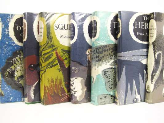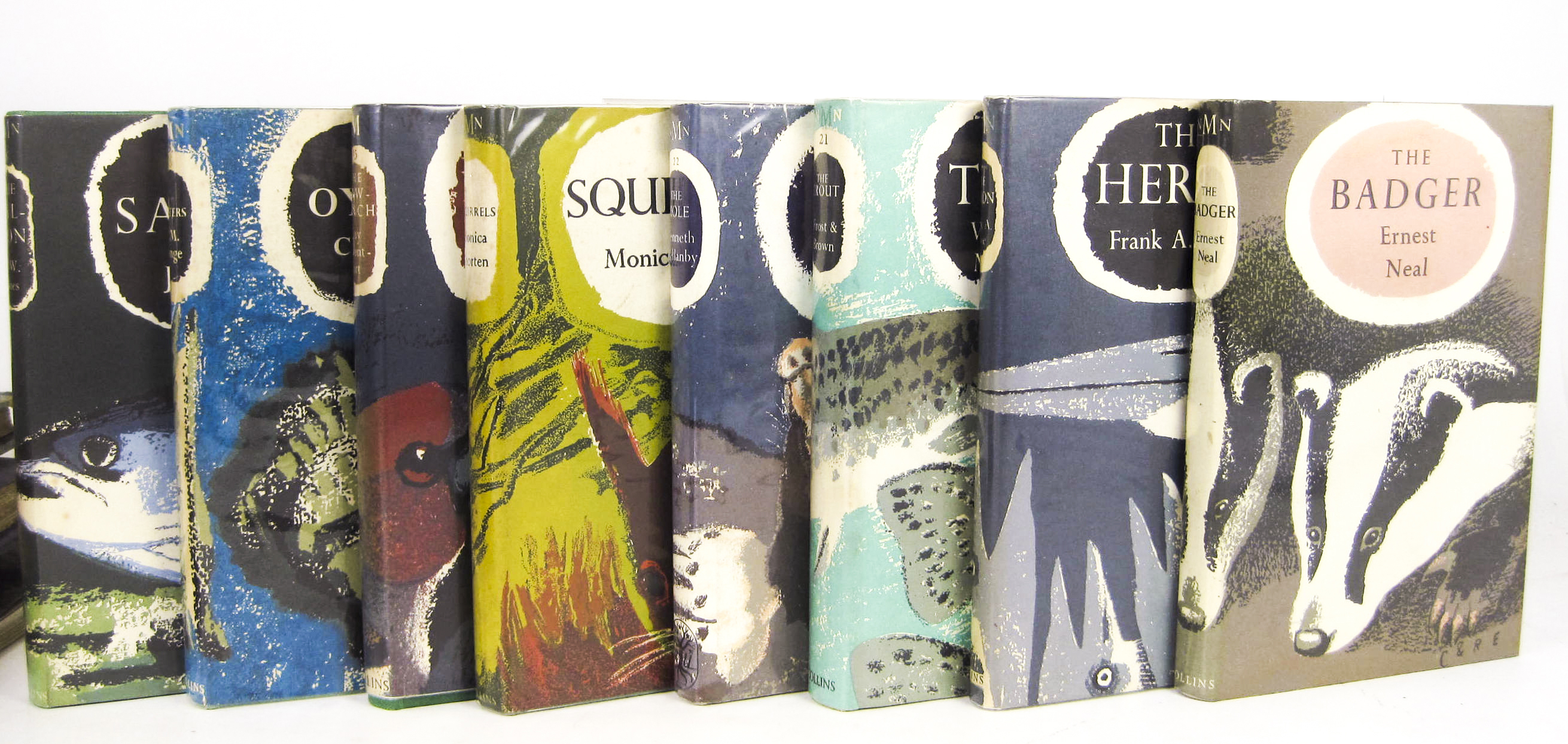 The badger (1), 1948, bookplates; Lowe, F.A. The heron. 1954, bookplate; Shorten, Monica Squirrels (12), 1954, dustwrapper slightly spotted; Yonge, C.M. Oysters (18), 1960; Mountford, Guy The hawfinch (15), 1957; Jones, J.W. The salmon (16), 1959; Frost, W.E. & M.E. Brown The trout (21)1967; Mellanby, K. The mole (22), Country Book Club, 1973, dustwrapper slightly marked all, but the last first editions, all with dustwrappers, none price clipped (8)