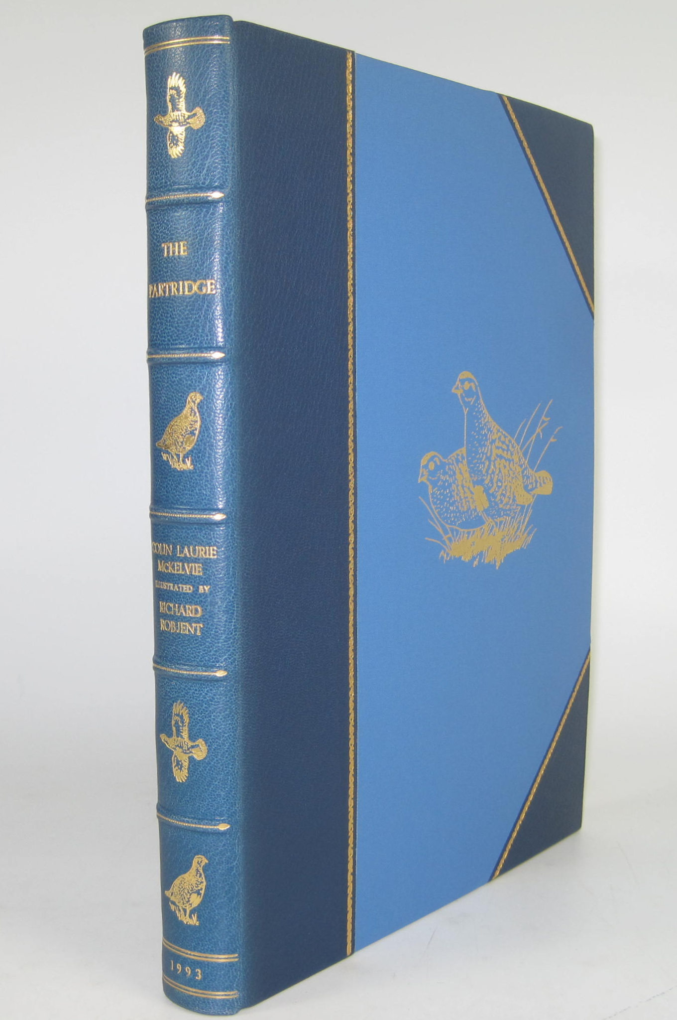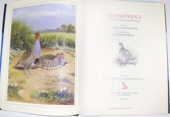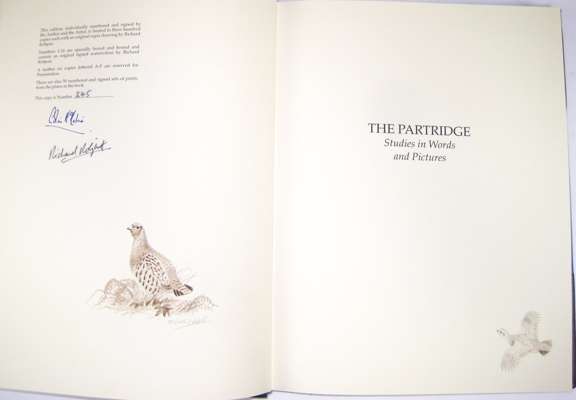 The Partridge, Studies in Words and Pictures. Norfolk: Fine Sporting Interests Ltd, 1993, 4to, number 245 of 300 copies, signed by both author and artist, original sepia drawing by illustrator beneath signatures, 24 tipped in colour plates, original half blue morocco gilt