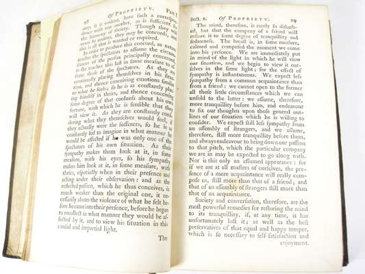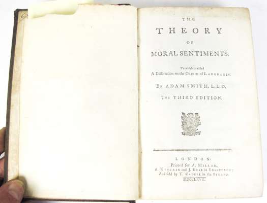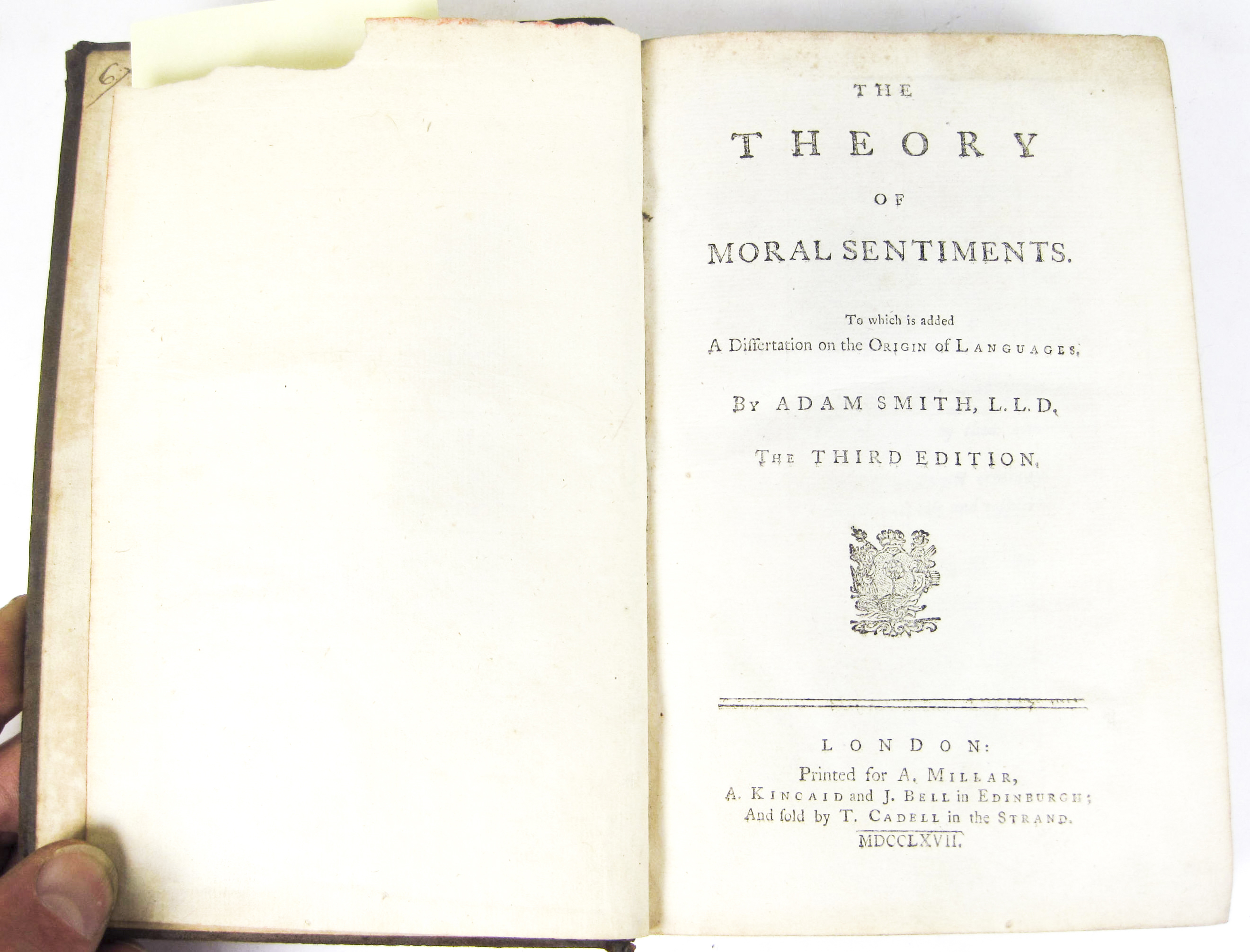 The theory of moral sentiments. London: A. Millar [&c.], 1767. Third edition, 8vo, contemporary reversed calf, some spotting, dust-soiling and dampstaining, worming in lower margin from GG5 to end affecting a few words, very worn, head of front free endpaper torn away