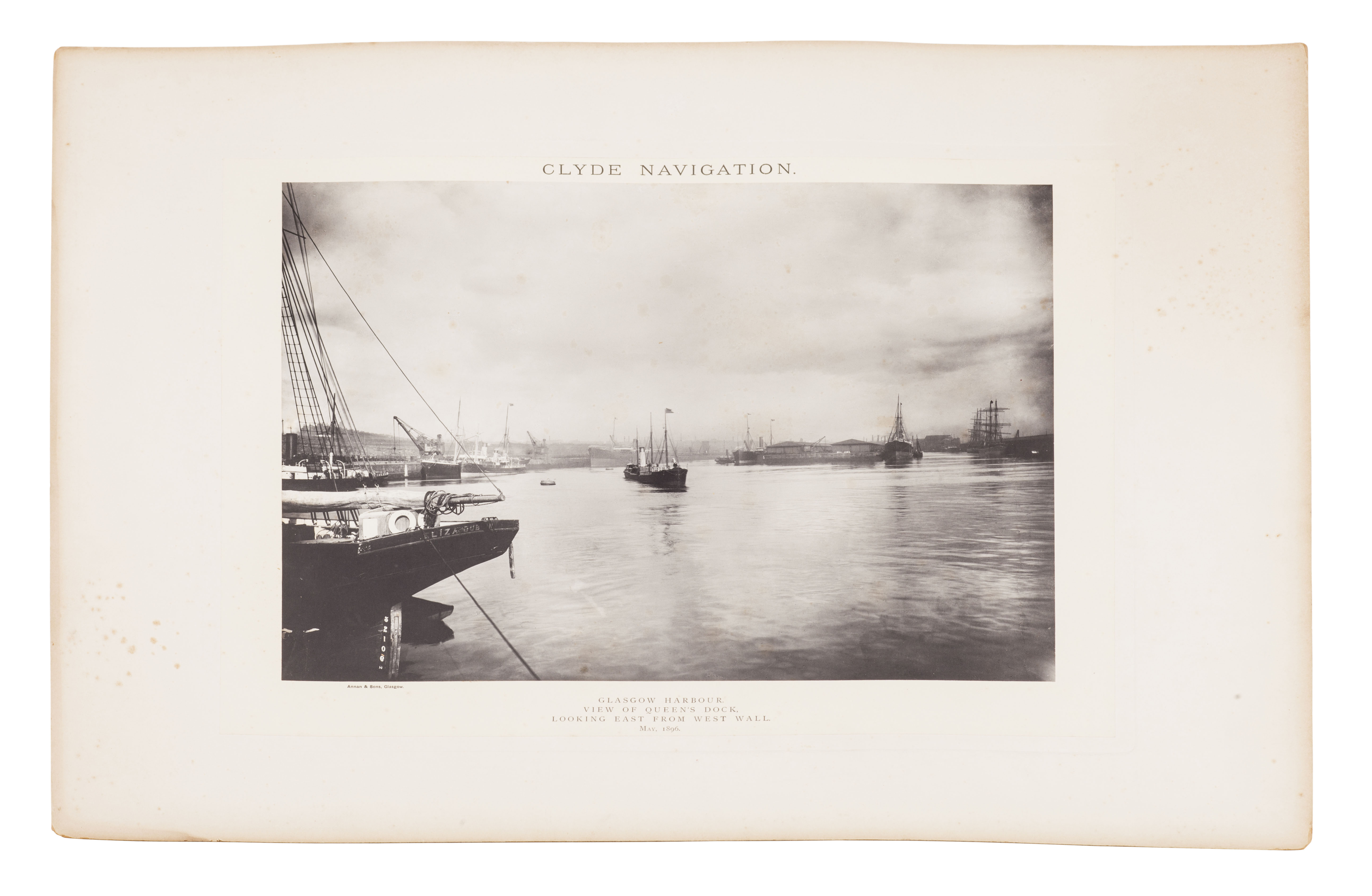 Photographs of Glasgow harbour and docks -- Clyde navigation, [1892-1897]. A collection of 8 platinum prints by Annan & Sons, comprising: - Glasgow Harbour. View of Glasgow Bridge, from south side. June, 1892. - Glasgow Harbour. North-west corner of south pier, Prince's Dock, in course of construction, September, 1894, showing arrangement of concrete cylinders and chock piles there, and building on top of cylinders of south wall of centre basin. - Glasgow Harbour. Looking East from entrance, to Graving Docks, showing entrance to Prince's Dock. May, 1896. - Glasgow Harbour. View of Queen's Dock, looking east from west wall. May, 1896. - Glasgow Harbour. Looking east from Govan passenger wharf. May, 1896. - Glasgow Harbour. Looking west from east end of Steamboat wharf. June, 1896. - Glasgow Harbour. No.3 Graving's Dock, looking outwards from head. April, 1898. - Glasgow Harbour. Prince's Dock, looking east from west end. May, 1898. Each image 34.5x45cm including margins, mounted and titled 'Clyde Navigation.", contained in red half morocco gilt folio case entitled 'Photographs of Glasgow Harbour and Docks', upper cover detached, worn, some foxing to photographs