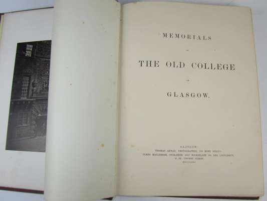 Memorials of the Old College of Glasgow. Glasgow: T. Annan, 1871. Folio, 28 (of 41) mounted carbon prints, [comprising 15 views, and portraits 1-13 of 25], original morocco-backed cloth