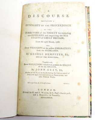 A discourse containing a summary of the proceedings of the Directors of the Society for extending the Fisheries and improving the Sea Coasts of Great Britain. London: G. & T. Wilke, & J. Debrett, 1789. First edition, 8vo, folding engraved plate, erratum slip, quarter calf, some spotting, [ESTC T120778]