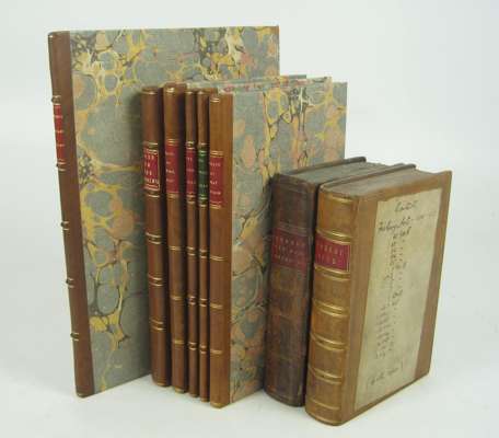 A seasonable Hint for our Pilchard and Coast Fishery. London: W. Sandby, 1748. First edition, 4to, half calf gilt, small repair to last leaf affecting one letter; Dodd, James S. An essay towards a natural history of the Herring. London: T. Vinent, 1752. First edition, 8vo, half-title, half calf gilt, lacks a plate; [Herring Fishery] A small collection of valuable tracts relating to the Herring Fishery. London: R. Griffiths, 1751. First edition, 8vo, quarter calf gilt; Oldmixon, John The Dutch Barrier our's: or the interest of England and Holland inseparable. London: A. Baldwin, 1712. First edition, 8vo, quarter calf gilt, uncut; [Herring Fishery] A translation of the Dutch Placart and Ordinance, for the Government of the Great Fishery. London: W. Owen, 1750. 8vo, quarter calf gilt; [Fisheries] The Wealth of Great Britain in the Ocean. London: M. Cooper & W. Owen, 1749. First edition, 8vo, quarter calf gilt; [Fishering Acts] Volume of 18 Fishery Acts from 48 Geo III Cap cx (1809) to 30 & 31 Vict. Cap lii (1867), 12mo, contemporary calf; Volume of Instructions for an Officer of the Fishery under the Act 48 Geo III. Cap 110, 48 & 55 Geo III, 1 Geo IV, 48 & 55 Geo III, and 1 & 5 Geo IV, with the Fishery Acts I Geo IV, 1 & 2 Geog IV, 5 Geo IV and 7 Geo IV, 12mo contemporary calf, the last two with Withdrawn from Scottish Office Library stamp to endpaper (8)