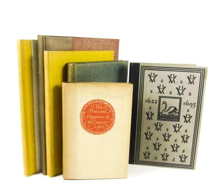 The praise and happinesse of the countrie-life, 1938. 12mo, number 358/400, original red half morocco, dust-jacket [Harrop 39]; Vaughan, Henry Poems, 1924. 8vo, number 306/500, original quarter cloth with printed boards [Harrop 2]; Thomas, Edward Selected poems, 1927. Large 8vo, number 245/275, Japanese vellum, original yellow cloth gilt [Harrop 6]; Omar Khayyâm Penillion [The Rubaiyat in Welsh], 1928. Small 4to, number 47/285 copies, orginal white and yellow cloth gilt [Harrop 13]; Gruffydd, W. J. Caniadau, 1932. 4to, number 38/275, original quarter cloth gilt [Harrop 21]; Jones, T. Gwynn Detholiad o ganiadau, 1926. 8vo, number 494/500, original blue cloth [Harrop 4] (6)
