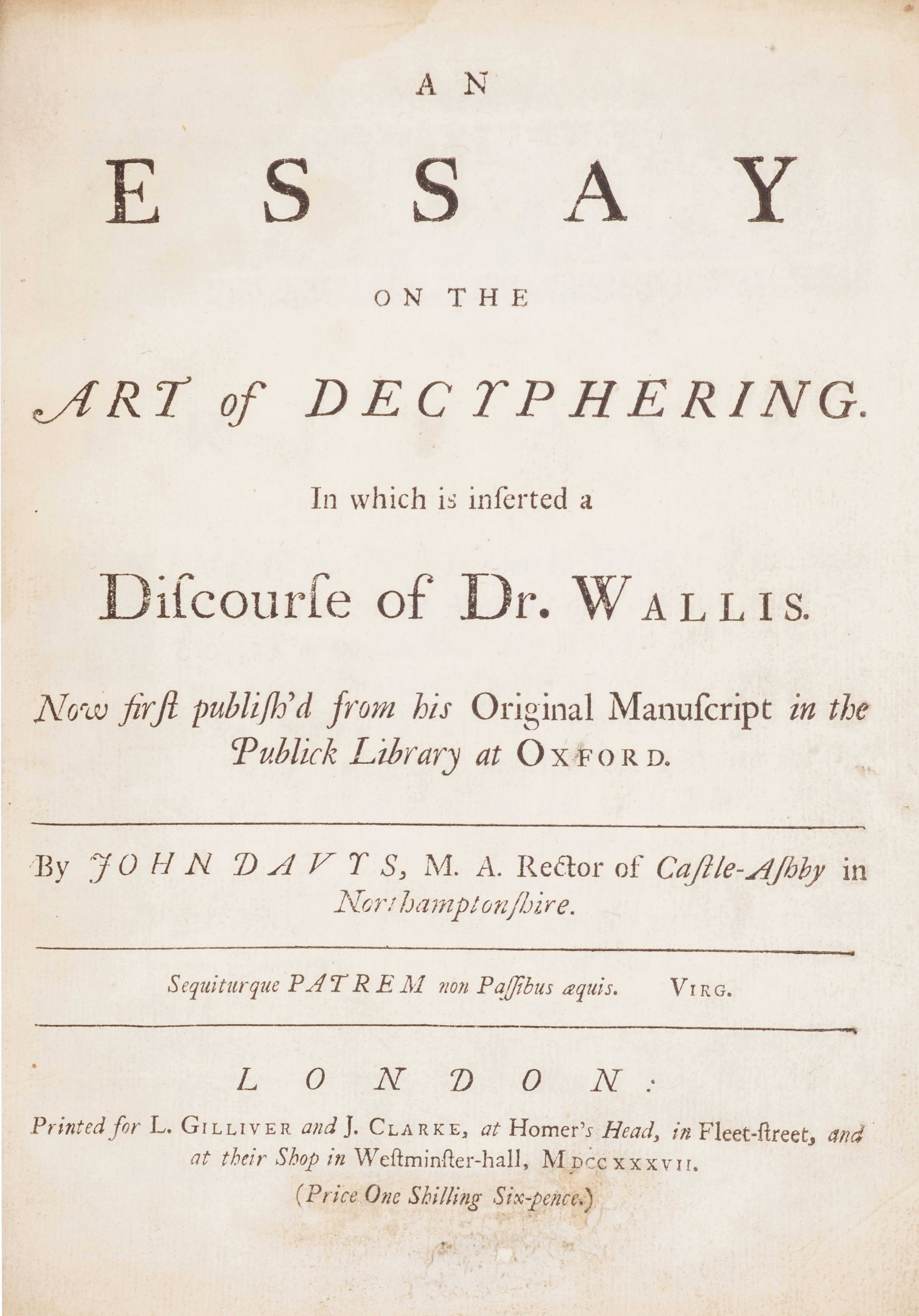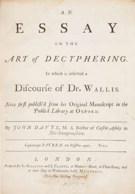An essay on the art of decyphering... London: L.Gilliver and J.Clarke, 1737. 4to, contemporary calf, lacking half-title, upper cover detached [ESTC T10607]