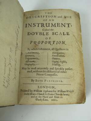 The description and use of an instrument called the double scale of proportion. London: William Leybourn, 1661. First edition, 12mo, 2 plates (1 folding) supplied in facsimile, contemporary calf, rebacked, replacement advert leaf pasted over advert on final page, ownership inscription and pencil notes to first flyleaf, lower right corner of pp.99-100 torn slightly affecting text, [ESTC R40063, Wing (CD-Rom, 1996), P630A]