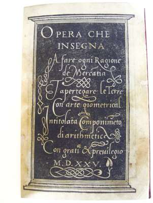Opera che insegna a fare ogni ragione de mercatia & a pertegare le terre con arte giometrical intitolata componimento di arithmetica. [Venice: Niccolò Zoppino], 1525. 8vo, woodcut title-page printed white on black, woodcut illustrations, nineteenth-century red morocco gilt by Leighton of Brewer Street, spine gilt in compartments, t.e.g., some slight worming and internal soiling