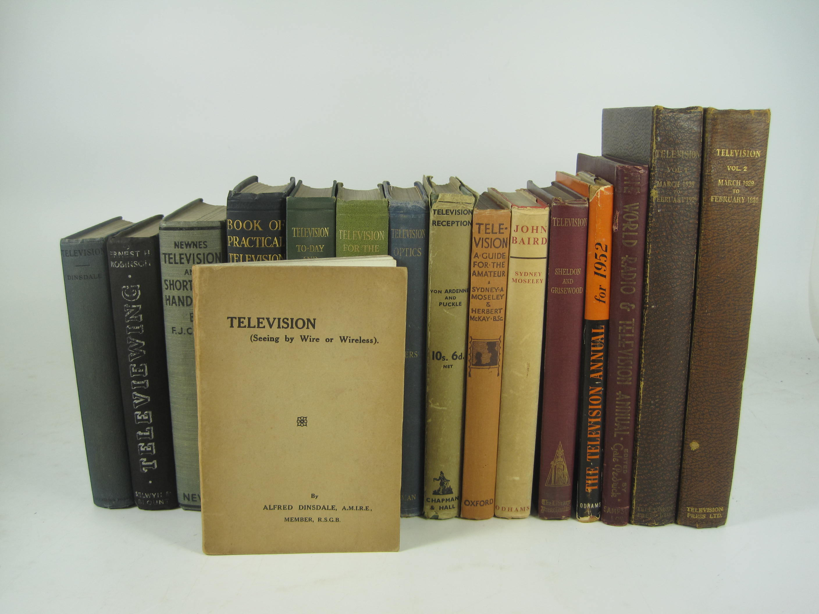 Television. (Seeing by wire or wireless). London: Sir Isaac Pitman & Sons, Ltd., 1926. 8vo, original card covers; [Idem] Television. London: Television Press, Ltd., 1928. 8vo, original cloth; Sheldon, H. Horton and Edgar Norman Grisewood Television, present methods of picture transmission, [n.d., 1930?] 8vo, second impression?, red cloth; Moseley, Sydney A. - H.J. Barton Chapple - John Logie Baird Television to-day and to-morrow. London: Sir Isaac Pitman & Sons, Ltd., 1931. Second edition, 8vo, signed by the author and Logie Baird to flyleaf; [Idem] Television for the amateur constructor. London: Sir Isaac Pitman & Sons, Ltd., 1933. 8vo, green cloth gilt; Camm, F.J. Newnes television and short-wave handbook. London: George Newnes, [1934]. 8vo, blue cloth, some damage to upper cover; Dowding, G.V., editor Book of practical television. London: The Amalgamated Press, 1935. 8vo, blue cloth; Robinson, Ernest H. Televiewing. London: Selwyn & Blount Ltd., [n.d., 1935?]. 8vo, black cloth; Myers, L.M. Television optics, an introduction. London: Sir Isaac Pitman & Sons, Ltd., 1936. 8vo, blue cloth gilt; Ardenne, Manfred von Television reception... London: Chapman & Hall, 1936. 8vo, green cloth, dust-jacket; Moseley, Sydney A. & Herbert McKay Television, a guide for the amateur, [1936]. 8vo, orange cloth, bookplate of F.O. Mosley; [Idem] John Baird. London Odhams Press Limited, [n.d.]. 8vo, orange cloth, dust-jacket; Television, the world's first television journal... March 1928-January 1929 AND March-October 1929, 2 volumes, brown cloth gilt; and 2 others, sold not subject to return (16)