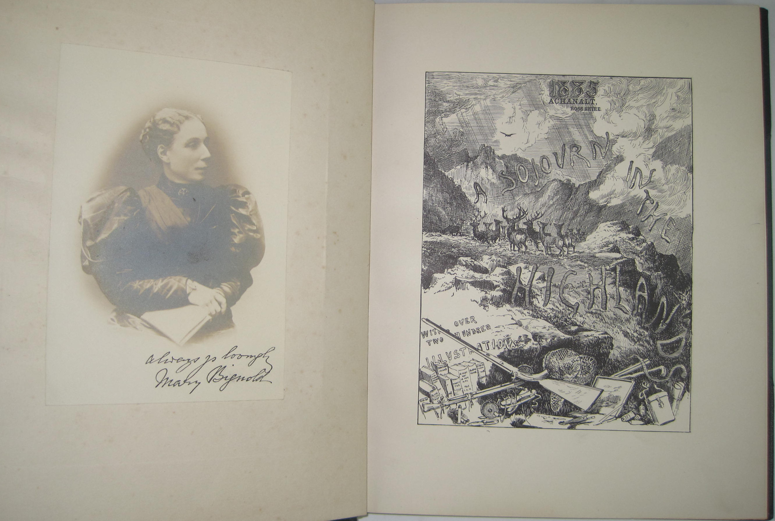 A sojourn in the Highlands, with over two hundred illustrations. Achanalt, Rosshire, 1885. 4to, original albumen print frontispiece of Mary Bignold, original upper wrapper of antlers initialled M.B. bound in at end, green half morocco, t.e.g.