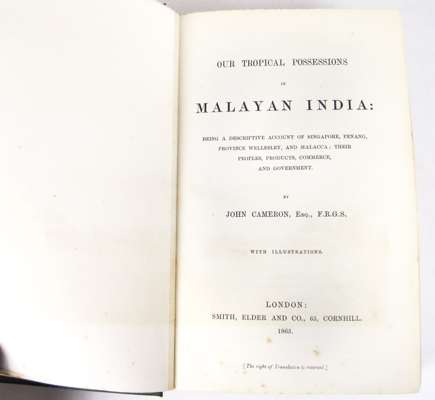 Our tropical possessions in Malayan India. London: Smith, Elder & Co., 1865. First edition, 8vo, 7 lithographed plates, original pictorial cloth, armorial bookplate, occasional light spotting