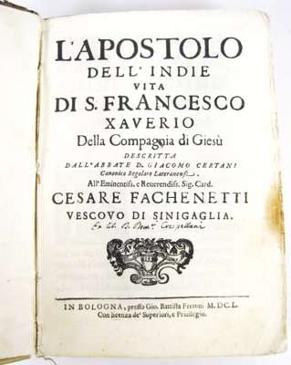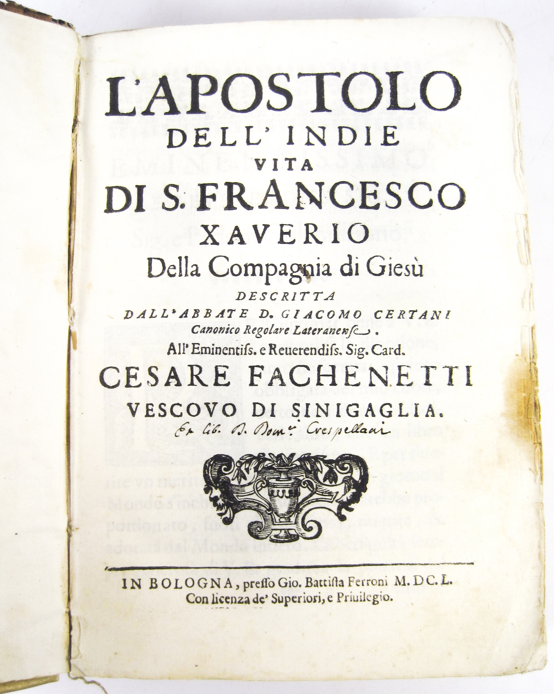 L'Apostolo dell'Indie vita di S. Francesco Xaverio della compangnia di Giesù. Bologna: Gio. Battista Ferroni, 1650. Small 4to, collates: [fo.4], 480pp./ +4, A4-Z4, Aa4-Zz4, Aaa4-Ooo4, contemporary quarter vellum over boards, paper label to spine covered with armorial plate, O1 creased obscuring some text, some words and letters erased with ink
