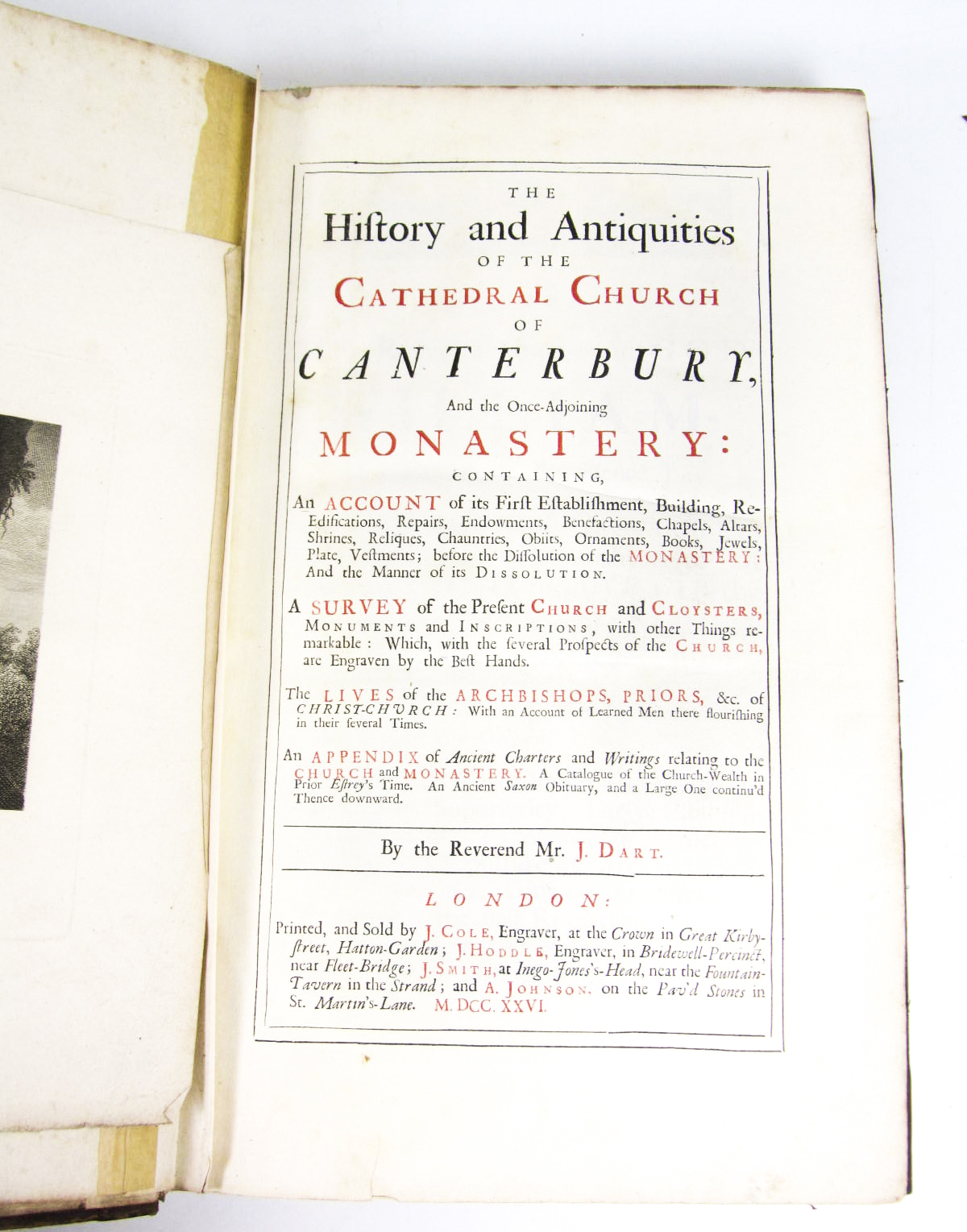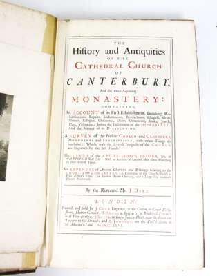 The history and the antiquities of the Cathedral Church of Canterbury... London: J. Cole..., 1726. Folio, title-page in red and black, plates form part of the pagination, contemporary calf, rebacked, bookplates and ownership inscription to paste-down endpaper, occasional offsetting and light soiling [ESTC T65420]; Hasted, Edward The history and topographical survey of the County of Kent... Canterbury: printed by W. Bristow, 1797-1801. 12 volumes, second edition, 67 (of 70?) maps and plates, all volumes contemporary half calf rebacked, several pages in facsimile and a few others lacking, many tears and repairs to maps; Batteley, John Antiquitates rutupinae. Oxford: Sheldon, 1745. 4to, half calf gilt, rebacked, with crest of a member of the Order of the Garter to covers; Planché, J.R. A corner of Kent, 1864. 8vo, modern quarter calf; Smith, Russell Bibliotheca Cantiana: a bibliographical account on the... county of Kent, 1838. 8vo, contemporary calf rebacked; Somner, William A treatise of the Roman ports and forts in Kent. Oxford: the Theater, 1693. 8vo, contemporary calf; [Idem] The common law of Kent: or the customs of gavelkind, 1788. Second edition, 8vo, contemporary calf; Thorpe, John, transcriber Registrum roffense..., 1769. Folio, modern half calf; Malcolm, J.P. Excursions in the counties of Kent, Gloucester, Hereford, Monmouth, and Somerset..., 1814. Second edition, 8vo, modern half calf; Furley, Robert A history of the Weald of Kent.... Ashford, 1871-74. 3 volumes, 8vo, original green cloth gilt; Elton, Charles I. The tenures of Kent, 1867. 8vo, red cloth gilt; Hasted History of Kent..., 1886. Folio, part 1 only; and 2 others, sold not subject to return (27)