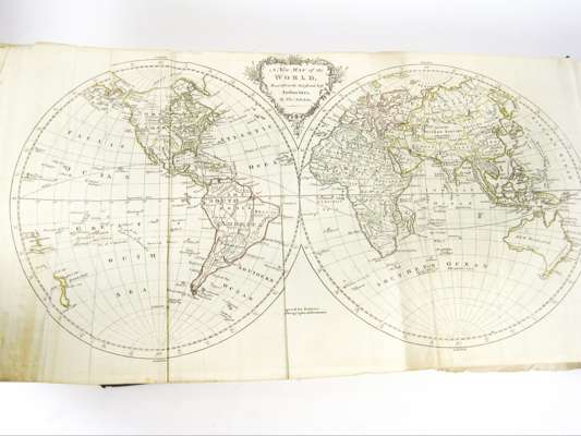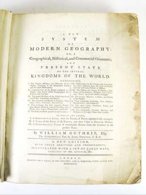 A new system of modern geography: or, a geographical, historical, and commercial grammar... London: C. Dilly [and] G. Robinson, 1780. Large 4to, plate, 20 folding maps (some torn, some with repairs, slight loss to map of Germany), contemporary revered calf, upper cover detached, some soiling and darkening, occasional pencil drawings [ESTC T206698]