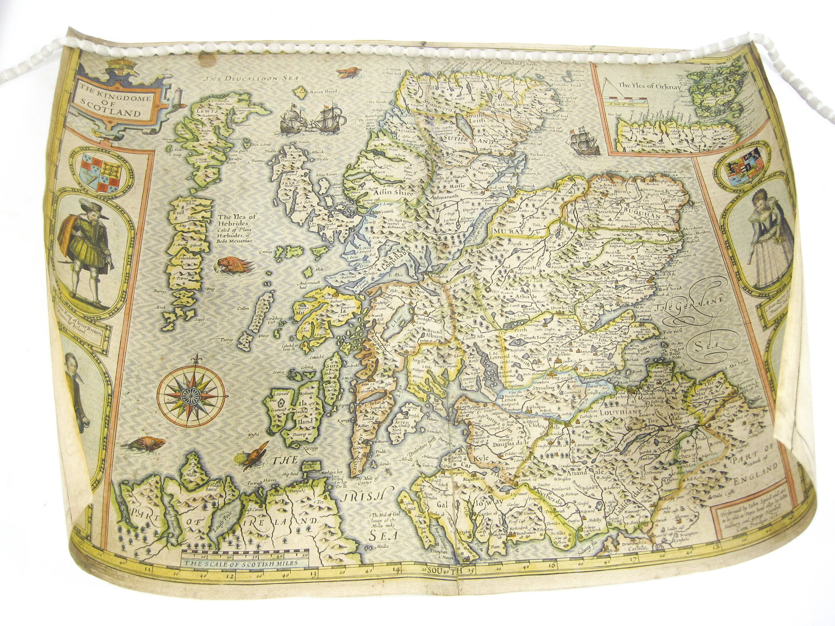 The Kingdome of Scotland, hand-coloured engraved map, first issue with inset portraits of King James, Henry Prince of Wales, Queen Anne and Charles Duke of York and imprint of John Sudbury and George Humbell, 1610, inset map of Orkney, 39 x 51cm., left and right edges supplied in facsimile affecting engraved areas