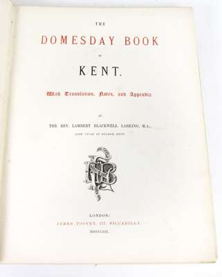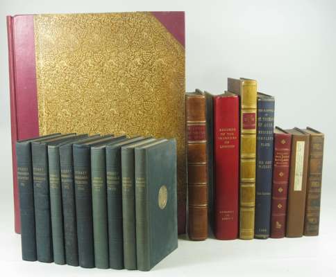 The Domesday book of Kent. London: James Toovey, 1869. Folio, 14 leaves of plates, red half cloth gilt over patterned boards; Lewis, John The history and antiquities, as well ecclesiastical as civil, of the Isle of Tenet, in Kent. London: J. Osborn, 1736. Second edition, 4to, title-page in red and black, portrait, 24 plates and a folding table, contemporary calf neatly rebacked, bookplate, neat marginalia in an early hand, some dampstaining to initial and final leaves; Lambert, John James Records of the Skinners of London, 1933. 4to, contemporary red quarter calf over vellum, presentation bookplate to M.L. Parkin by the Skinners' Company; Malcolm, James Peller Anecdotes of the manners and customs of London..., 1810. 2 volumes, 8vo, volume 1 in calf and volume 2 in modern quarter cloth, bookplates of William Gordon; Sherwell, John W. A descriptive and historical account of the Guild of Saddlers, 1889. 8vo, contemporary red half morocco with Saddlers' crest to upper cover, presentation bookplate to Aubrey Ridsdale; Luckett, Richard, editor The cryes of London. [Cambridge?:] Old Hall Press, 1994. 4to, quarter calf over patterned boards; Surrey Archaeological Collections Oakley, K.P., & Co. A survey of the Farnham district. Guildford, 1939. 8vo, green cloth gilt; Pealting, A.V. Ancient stained and painted glass in the churches of Surrey. Guildford, 1930. 8vo, green cloth gilt; Surrey Archaeological Society Surrey archaeological collections, 1901-1946. Volumes 16-30; 32; 39-49, 2 general indexes; [and] Lewis, Frank B., editor Pedes finium..., 1894. Uniform 8vo, various shades of green cloth gilt; [Gray] Newbury and its environs... Speenhamland: Hall and Marsh, 1839. 8vo, red half morocco gilt; sold not subject to return (quantity)