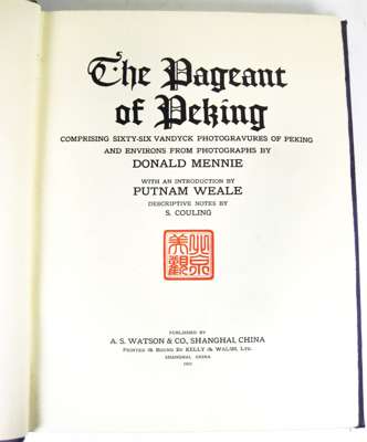 The pageant of Peking. Shanghai: A.S. Watson, 1922. Third edition, 4to, 66 photogravures by Donald Mennie, original purple silk gilt, some spotting, occasional soiling, some wear, fading and discolouration to covers