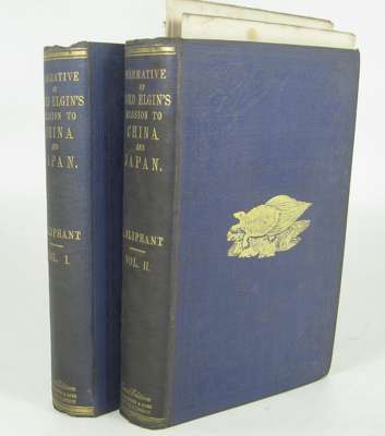 Narrative of the Earl of Elgin's mission to China and Japan. Edinburgh: W. Blackwood, 1860. Second edition, 2 volumes, 8vo, 5 folding maps, 20 lithographed plates, original cloth, somewhat spotted, pp. 7-10 and 99-110 detached, a few margins dust-soiled, bindings a bit dust-soiled and stained