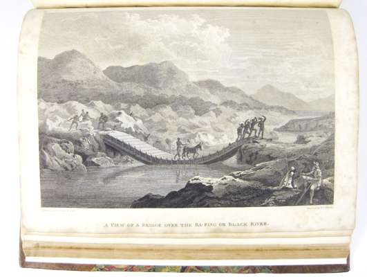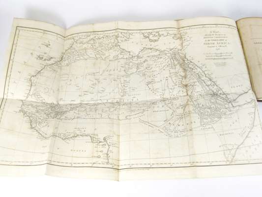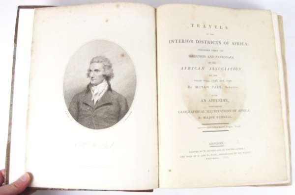 Travels in the interior districts of Africa... London: W. Bulmer, 1799. First edition, 4to, portrait, post-script of an African song and music bound in following list of subscribers, 3 folding maps (2 linen-backed), 5 plates, lacks half-title, modern blind-tooled calf with gilt lettering to spine [ESTC N13836]