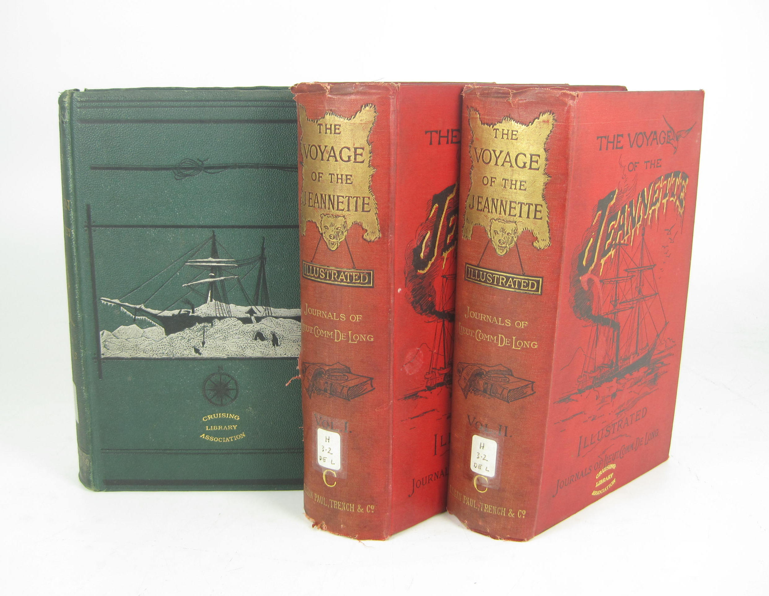 The German Arctic expedition... London: Sampson Low, Marston, Low, & Searle, 1874. 8vo, colour frontispiece, 3 colour plates, 31 plain plates and 2 maps (one folding), original green cloth with ship motif to upper cover, Cruising Association bookplate and stamps to covers and internally, some foxing, joints weak, rubbed; DeLong, George W. The voyage of the Jeannette... London: Kegan Paul, Trench and Company, 1883. 2 volumes, 8vo, 18 plates, 2 double-page diagrams and 4 maps (final map in volume 1 bound in), original pictorial red cloth gilt, bookplates, Cruising Association stamps, some tears to plates and maps, covers rubbed and detached (3)