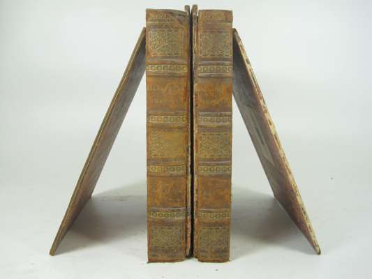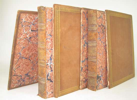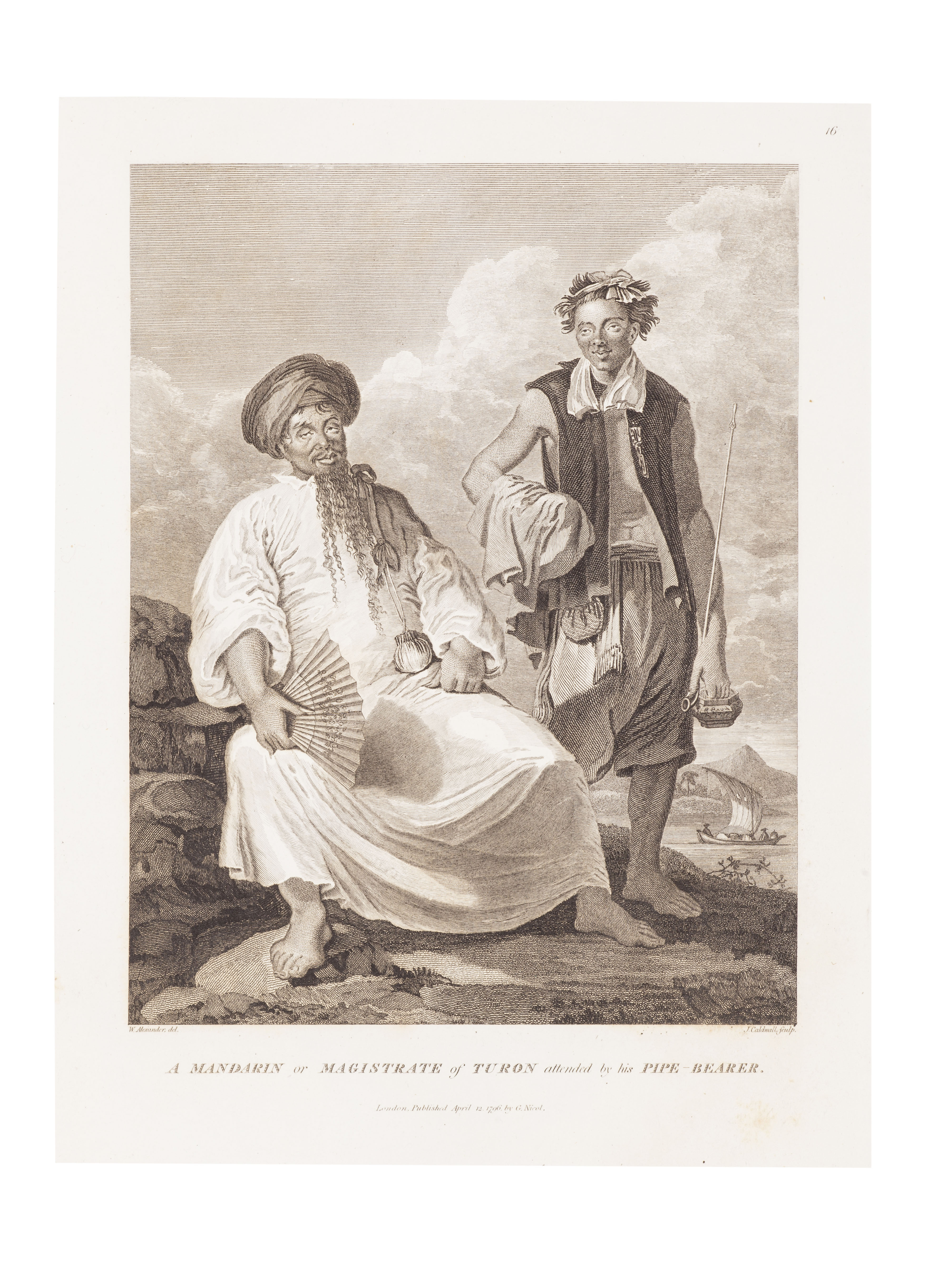 An authentic account of an embassy from the king of Great Britain to the Emperor of China. London: G. Nicol., 1797. First edition, 2 volumes, 4to and one volume, folio, text with 2 engraved frontispieces, atlas with folding map and 43 plates, text contemporary calf, very worn, covers detached; atlas half calf, somewhat spotted, worn, cover detached
