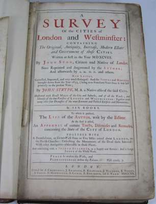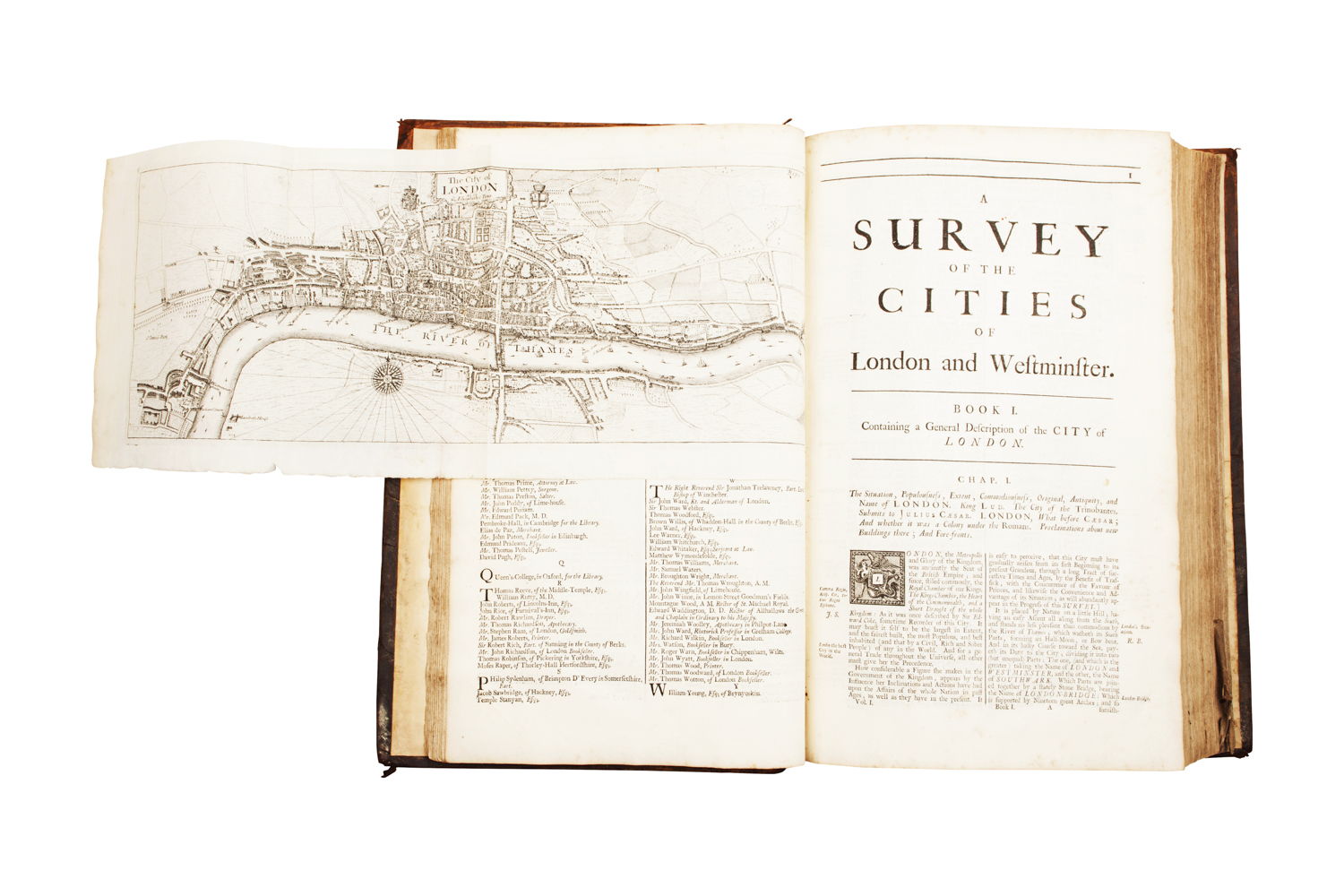 A survey of the cities of London and Westminster... London: A. Churchill, J. Knapton..., 1720. Folio, volume 1 (of 2) only, collates: [4], xii. xliv, 146, 155-158, 151-308; 208; 285, [1], title-page in red and black, 43 plates, maps and plans, many folding (the full set contains 71), contemporary calf rebacked, a few tears along some plate folds, hole to pp.251-2 with loss to a couple of letters, some staining, covers rubbed, spine ends bumped and chipped [ESTC T48975]