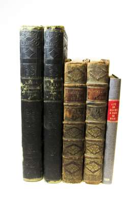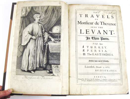 The travels of Monsieur de Thevenot into the Levant. London: H. Faithorne, J. Adamson, C. Skegnes and T. Newborough, 1687. First English edition, 3 parts in one volume, 4to, portrait, 3 engraved plates, modern half calf, portrait laid-down onto blank, one initial leaf appears to be lacking, pp.177-178 missing but signatures appear to be complete in this area, repair to lower inner corner of title-page, occasional marginal worming, some dust-soiling and slight dampstaining, spine faded [ESTC R17556]; Carne, John - W.H. Bartlett Syria, the Holy Land, Asia Minor &c., illustrated. London: Fisher & Son, [1836-38]. 3 volumes in 2, 4to, 3 engraved titles and 119 plates and maps; [bound with] 12 plates from Robert Batty, Select views of some of the principal cities of Europe.; contemporary embossed cloth in a rococo design, gilt doublures, g.e., boards reattached, some rubbing; Robertson, William The history of Scotland. London: A. Millar, 1759. 2 volumes, 4to, contemporary calf, bookplates of Lord Colvill of Culross, joints split, repaired tear to pp.229-30 in volume 1 [ESTC T78970]; and one other, sold not subject to return (6)